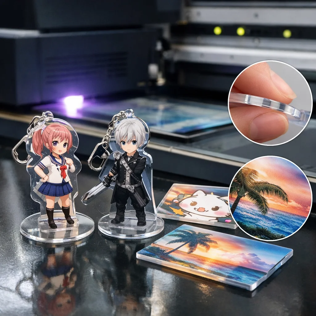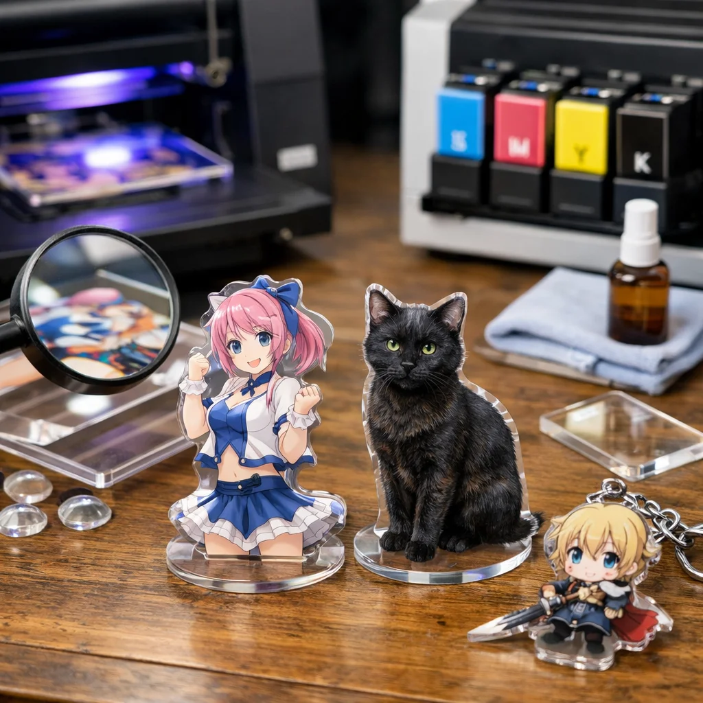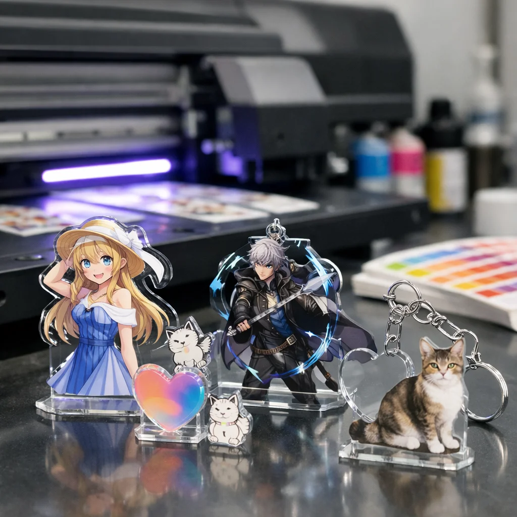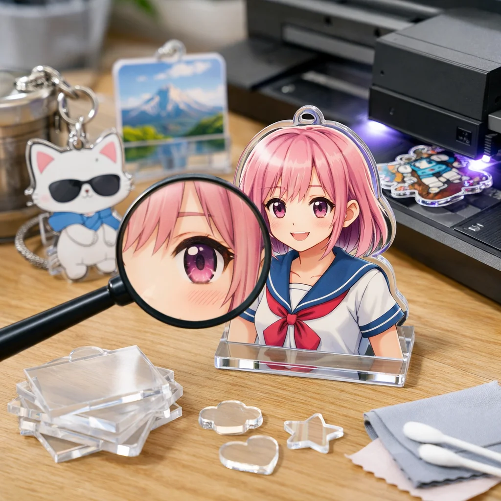UV印刷を利用した新しいデザインアイデアを提案しました。アクリルキーホルダー、スタンド、プレートの各カテゴリで、白版やクリア盛り、多層などの技術を活かし、注意点を明確にしました。質の高いアクリルグッズ製作には、デザインの精度が重要です。