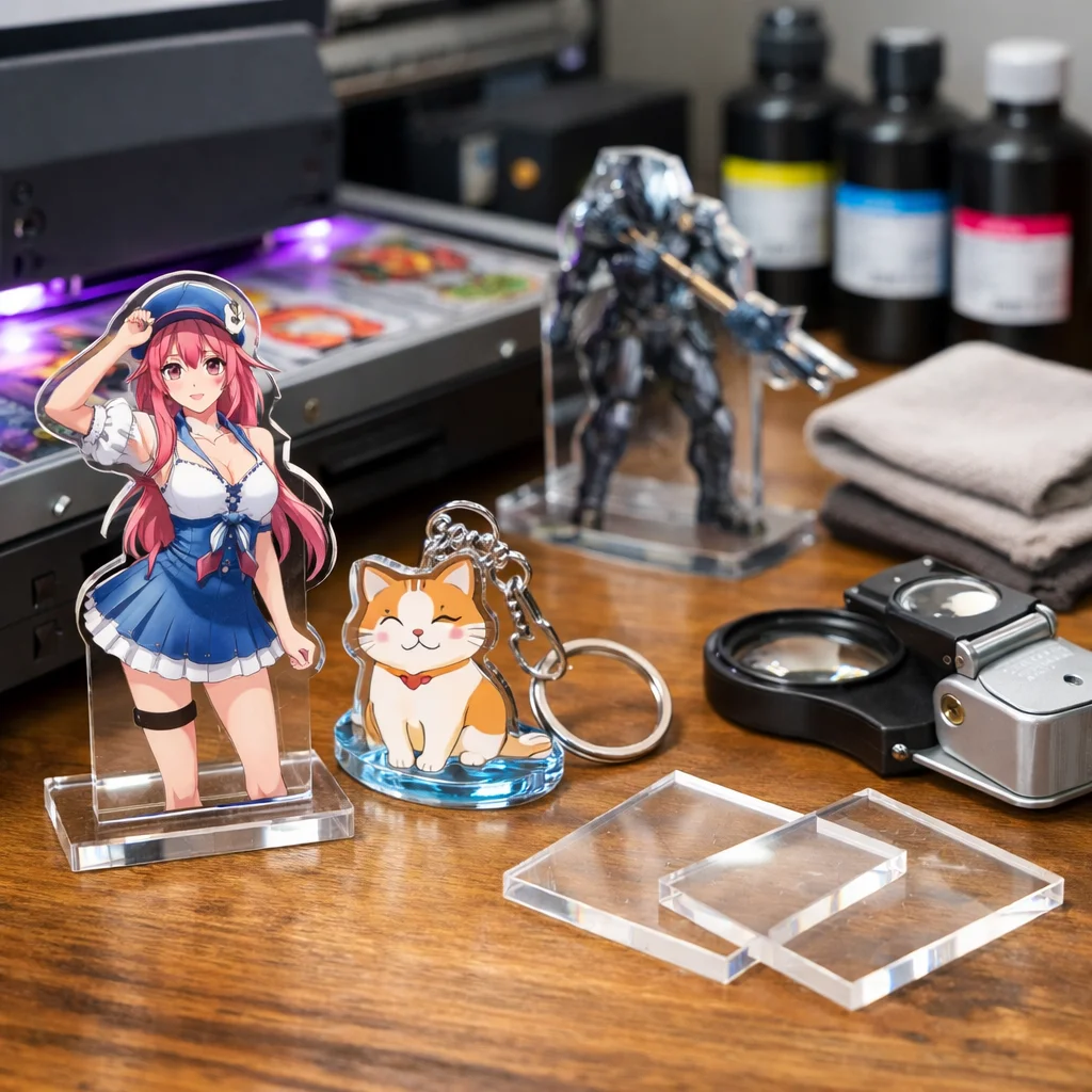 用途別に見ると、アクリルキーホルダーやアクリルスタンド(アクスタ)、プレートなどには、それぞれ特有のリスクが存在します。アクキーは持ち運びが多いため、摩耗が生じやすいですが、アクスタは比較的安全です。一方、薄板のプレートは屈曲のリスクが高く、デザインによっては反りが生じることがあるため、使用素材選びが重要です。