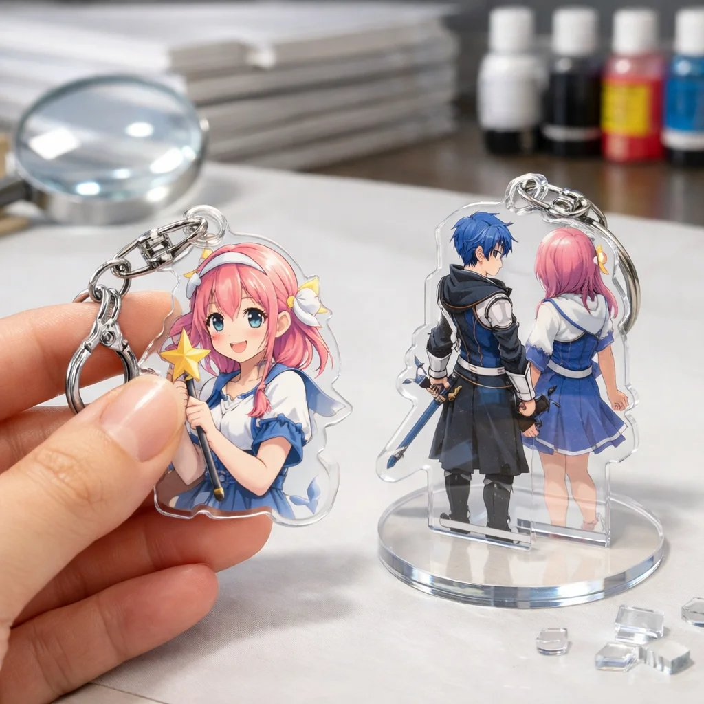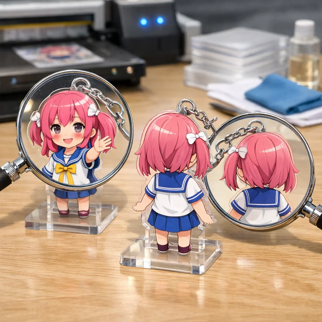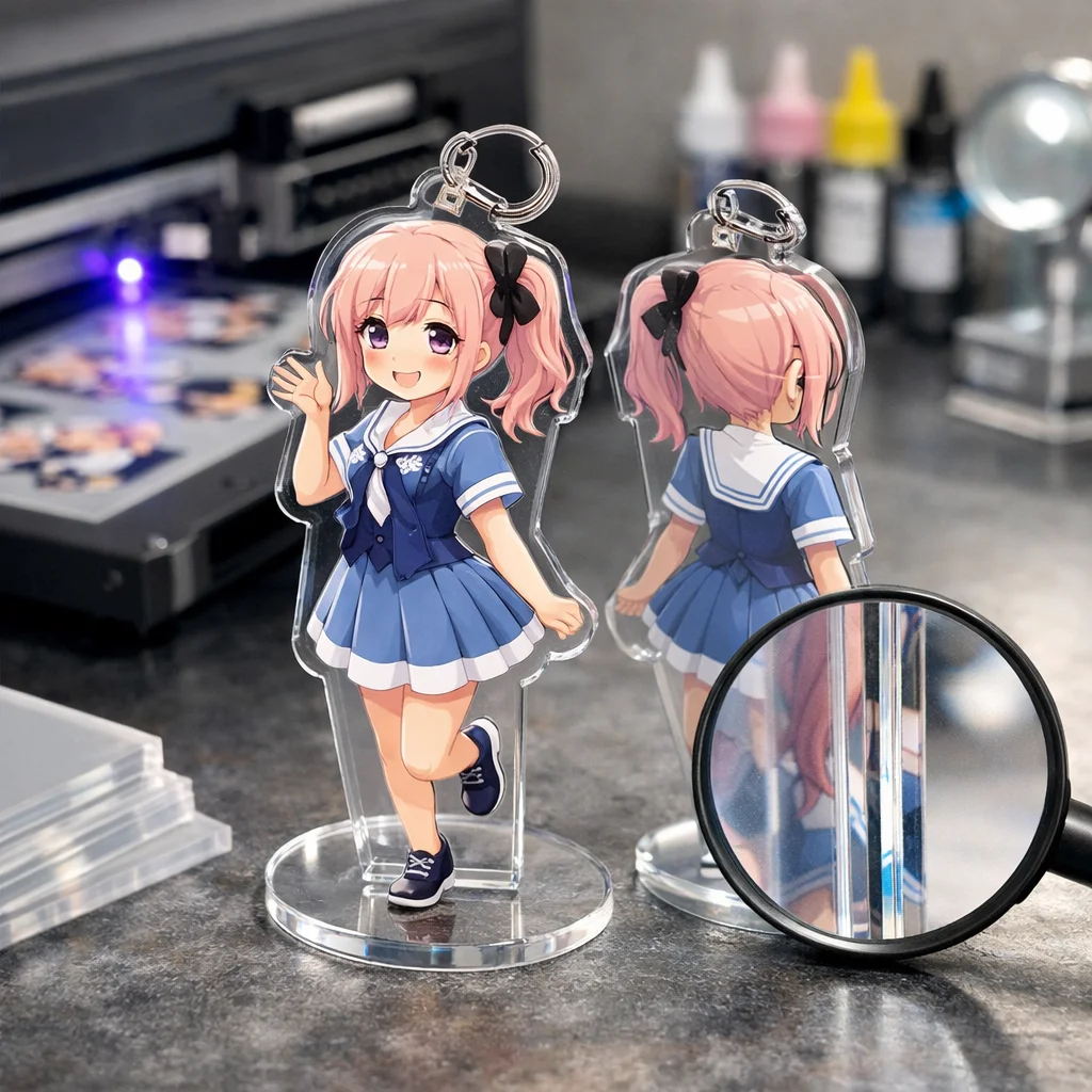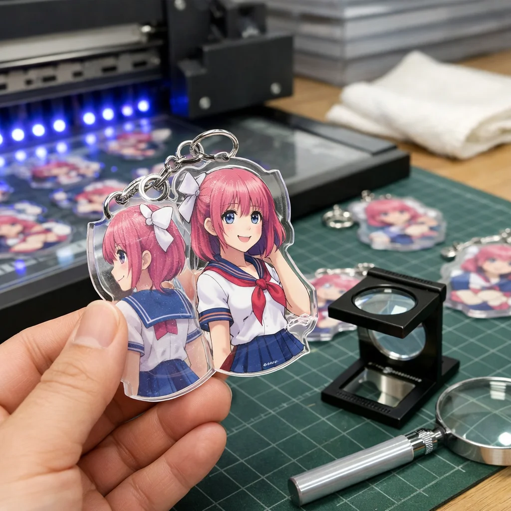 まず、個人向けの活用方法ですが、同人活動やファンイベントにおいて、両面印刷のアクリルグッズは非常に人気があります。例えば、ファンアートを印刷した【アクリルスタンド】やキーホルダーは、両面にデザインを施すことで、奥行きが出て、より立体的な印象を与えます。このようなデザインは、従来の片面印刷では表現できない視覚的な魅力を提供し、ファン同士の交流の場で、あなたの作品を一層引き立てる役割を果たします。