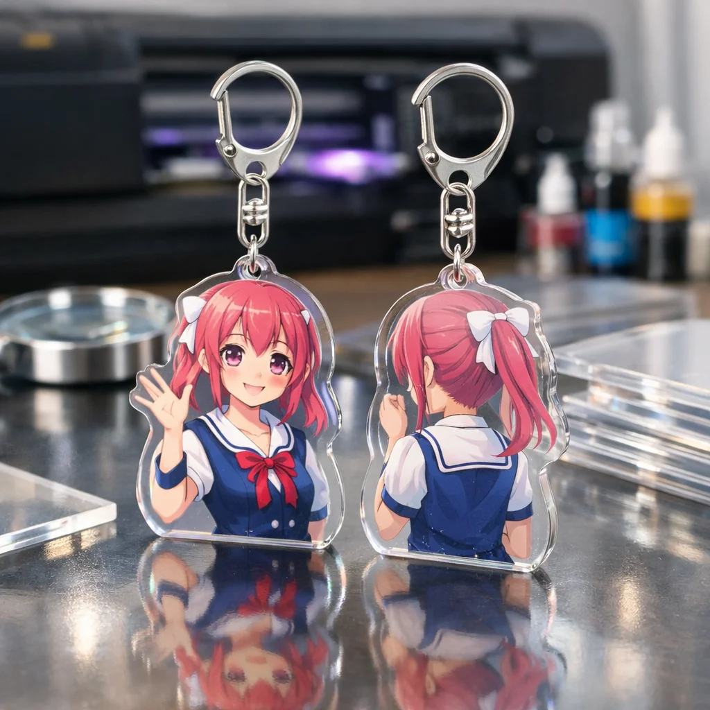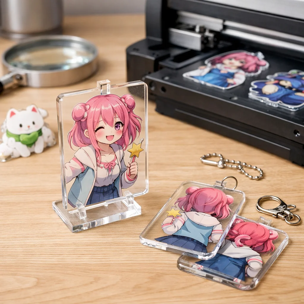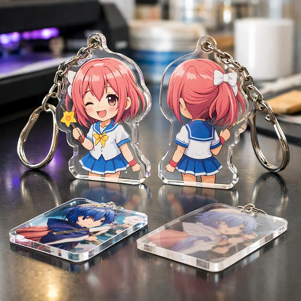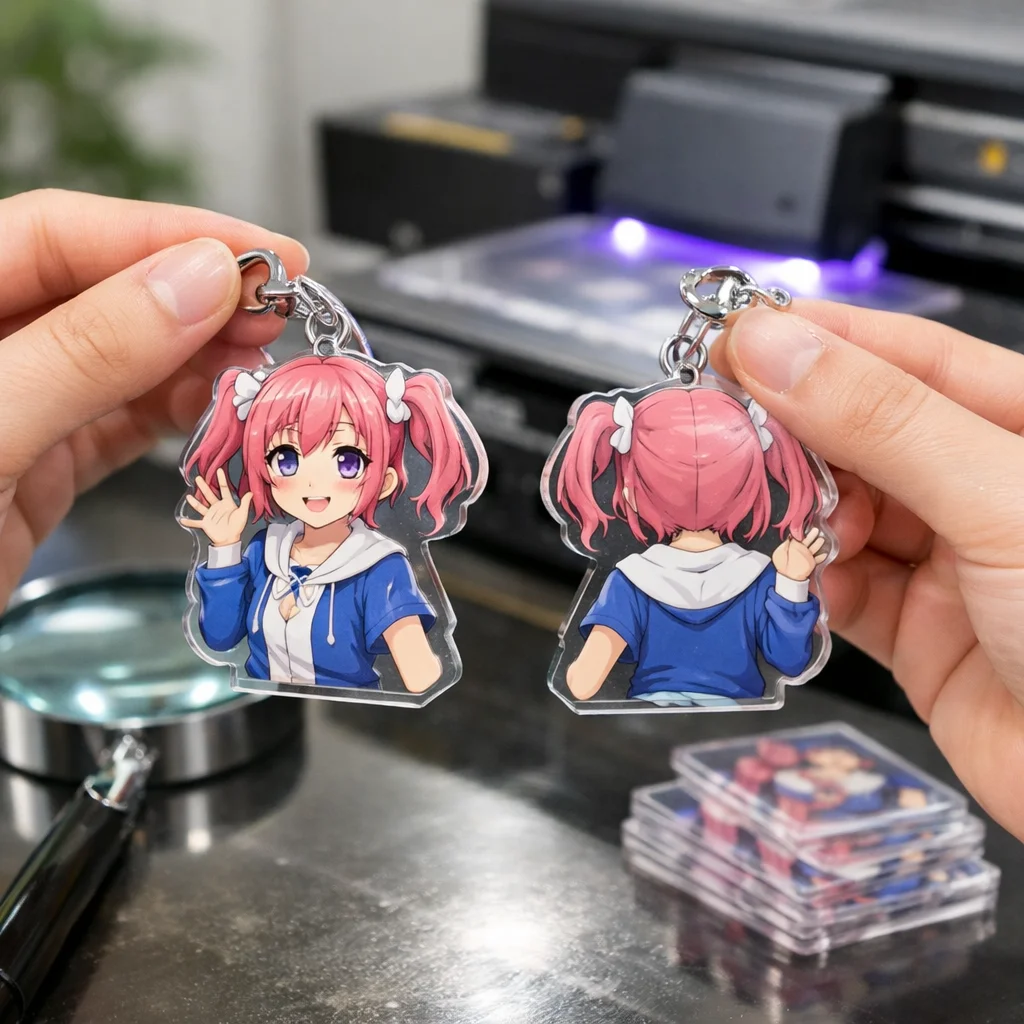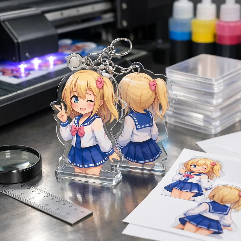 まず、個人向けの活用方法ですが、同人活動やファンイベントにおいて、両面印刷のアクリルグッズは非常に人気があります。例えば、ファンアートを印刷した【アクリルスタンド】やキーホルダーは、両面にデザインを施すことで、奥行きが出て、より立体的な印象を与えます。このようなデザインは、従来の片面印刷では表現できない視覚的な魅力を提供し、ファン同士の交流の場で、あなたの作品を一層引き立てる役割を果たします。