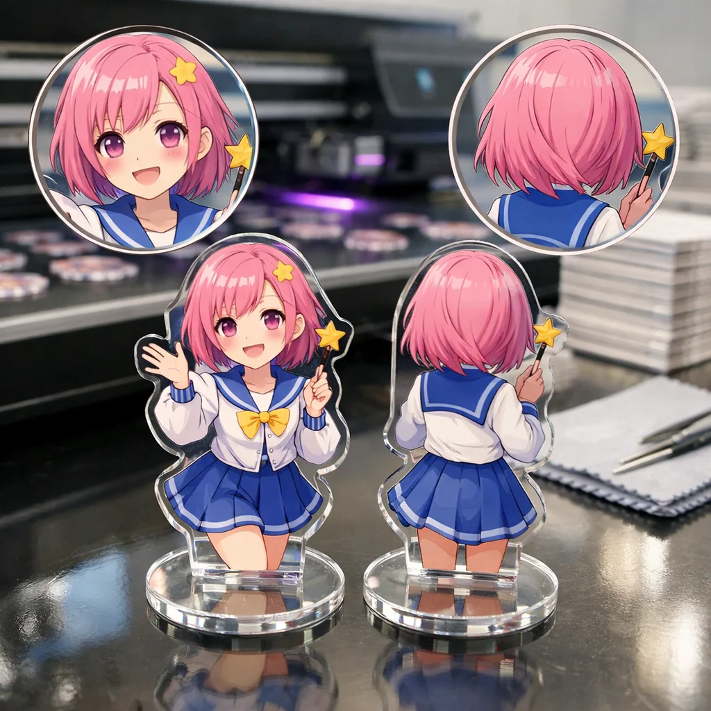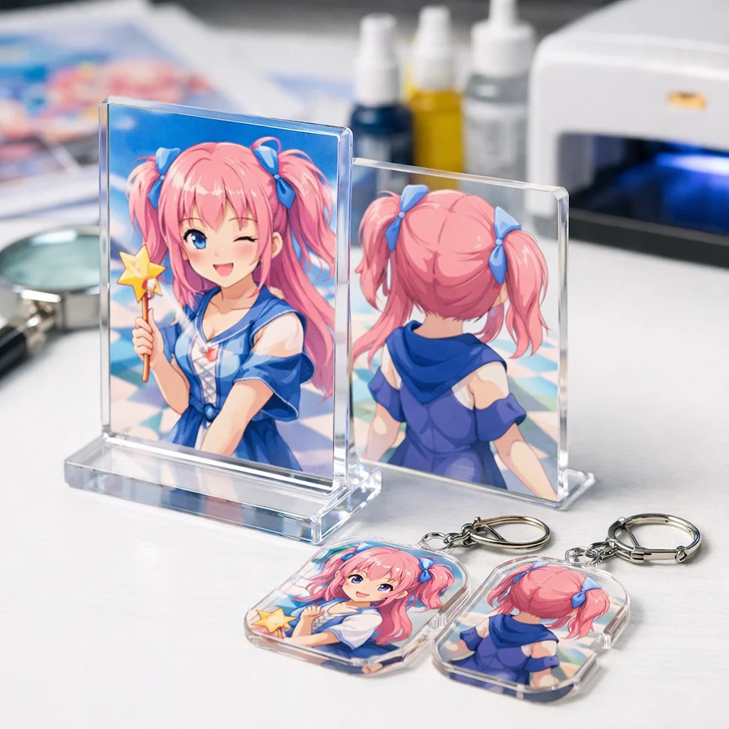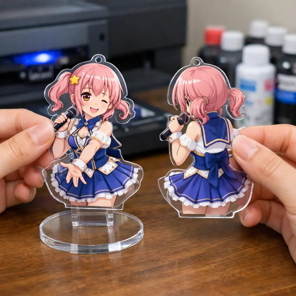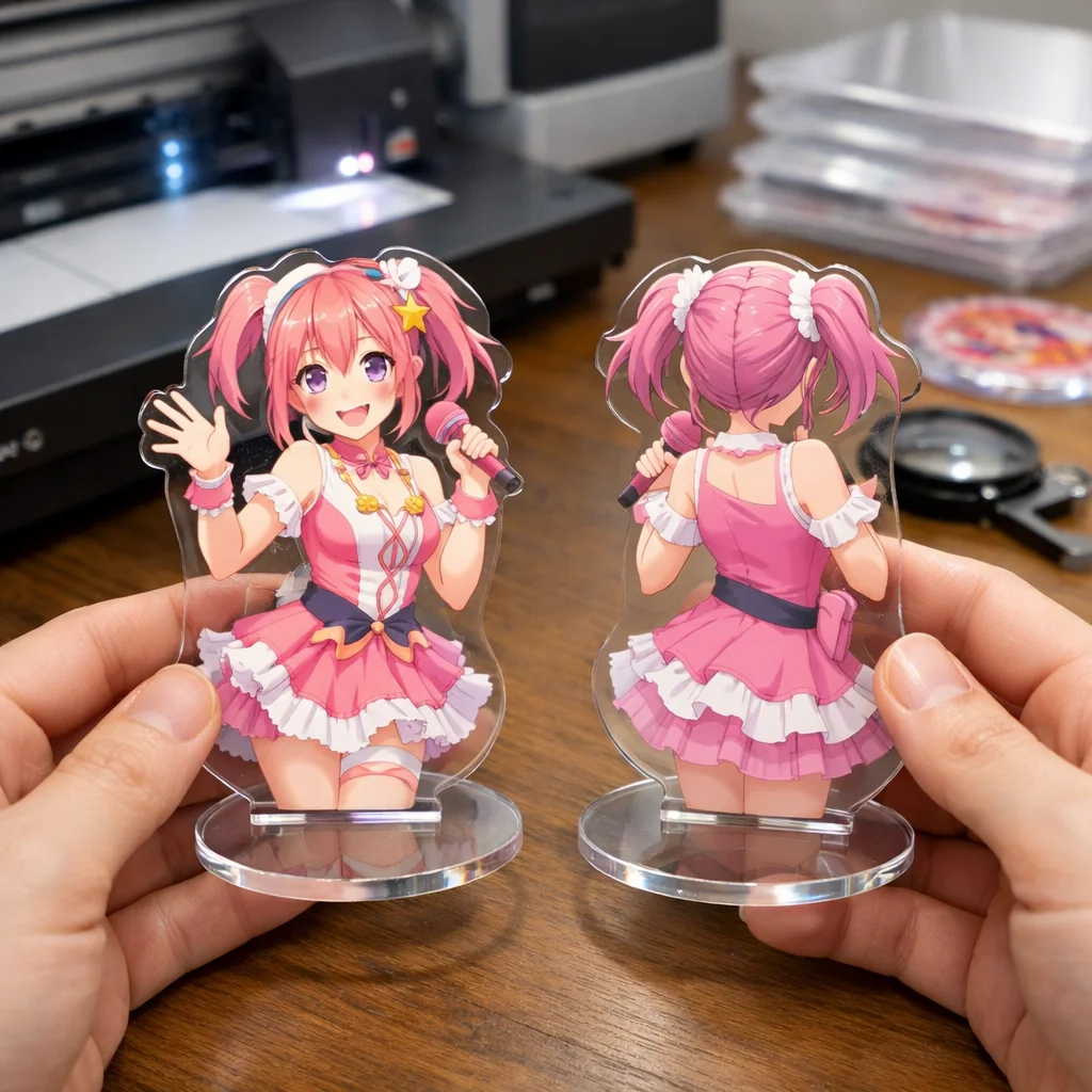 – アクリルスタンド:両面にデザインを施すことで、どの方向から見ても美しい仕上がりとなり、ディスプレイ効果が向上します。