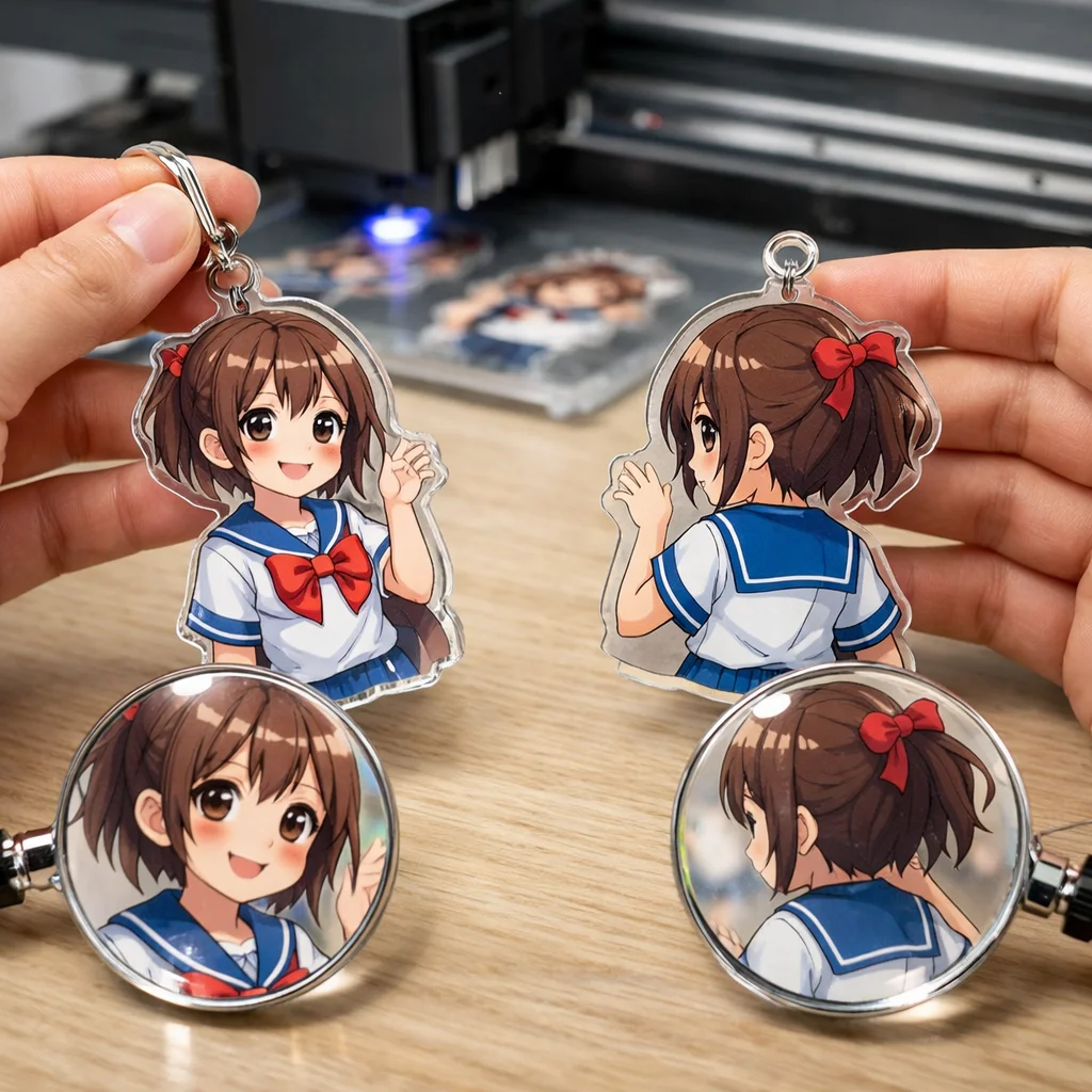 – アクリルキーホルダー(アクキー):両面に異なるデザインやキャラクターを印刷することで、360度どの角度から見ても楽しめるデザインが可能です。