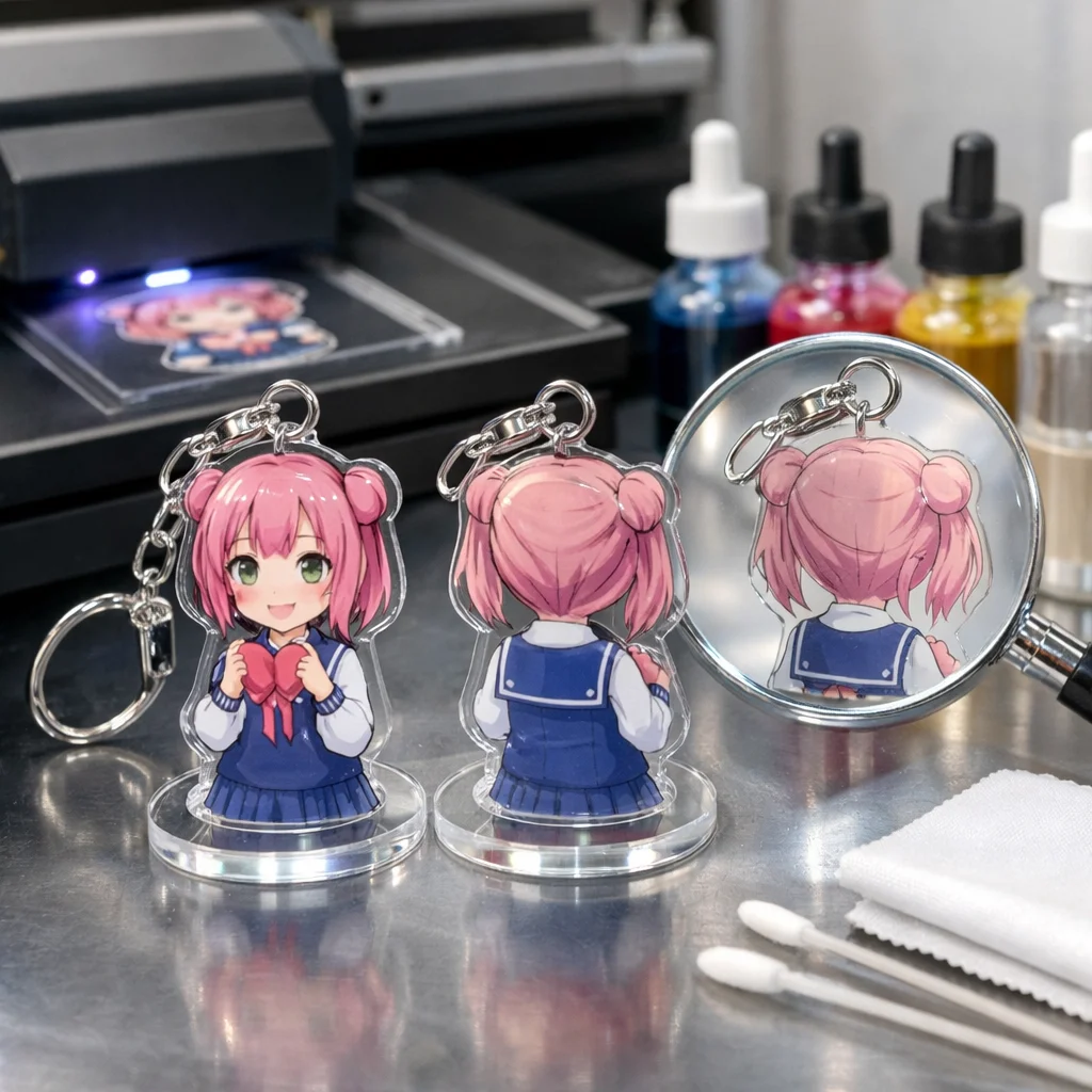 両面印刷はアクリルグッズに欠かせない技術です。表刷り、裏刷り、白版、クリア層、仕上げの工程を理解することで、色の再現性や視認性を確保できます。特に、白版や絵柄のズレに注意を払い、正しい視点からのデザインを考慮することが重要です。