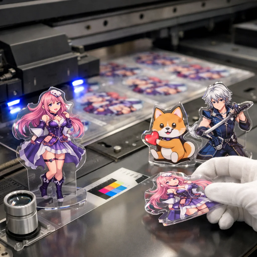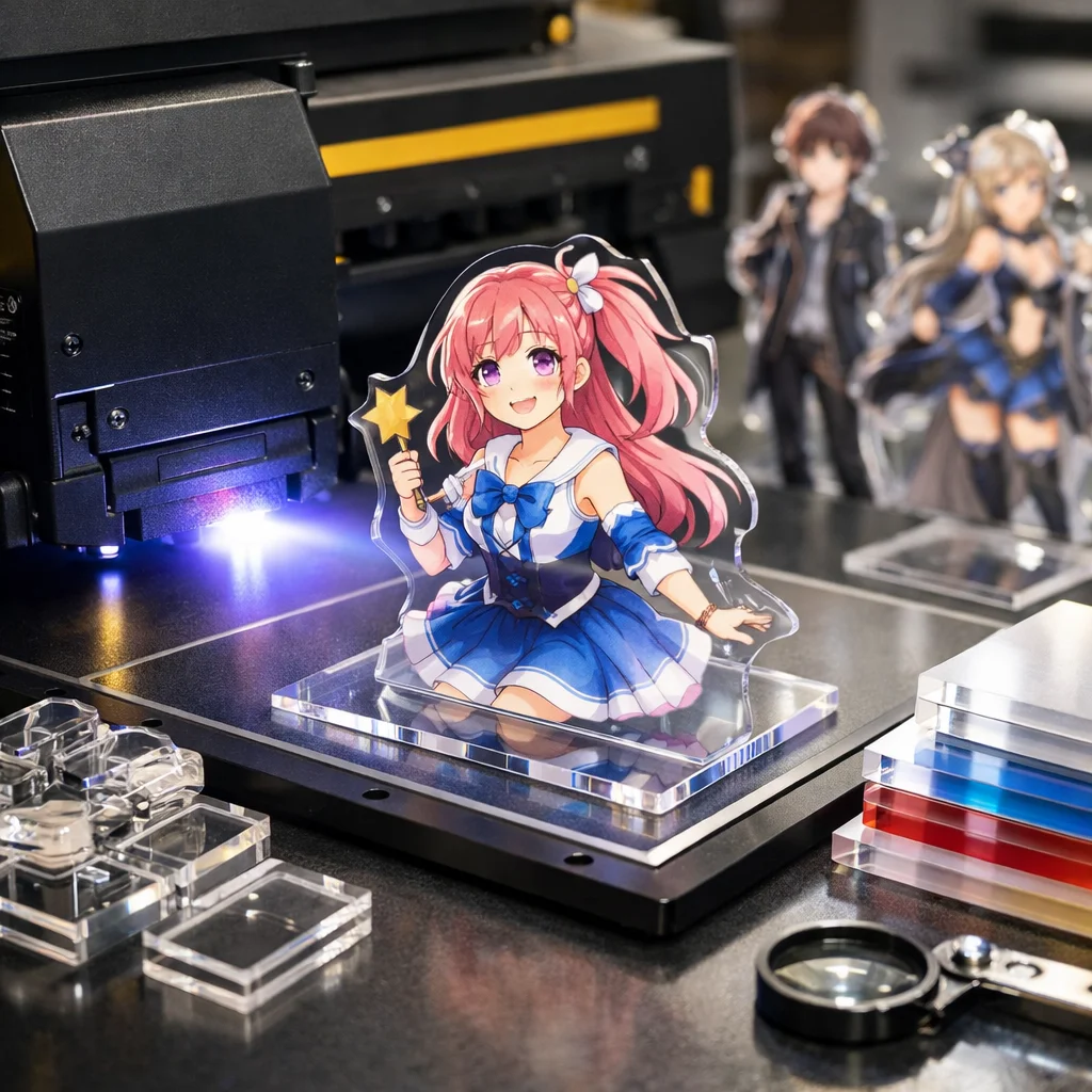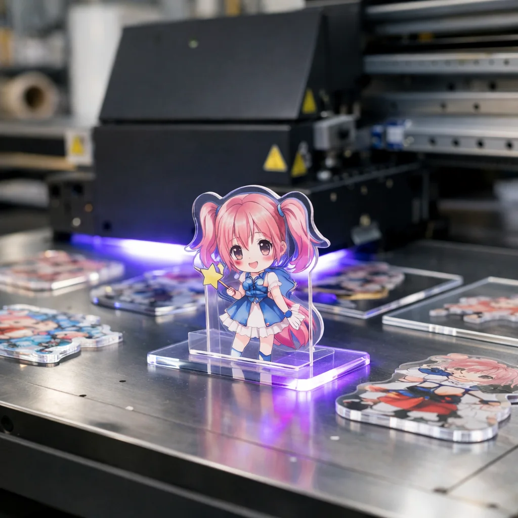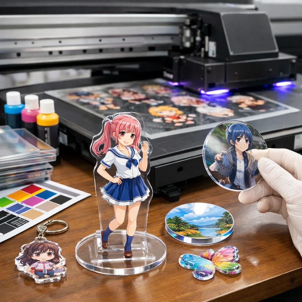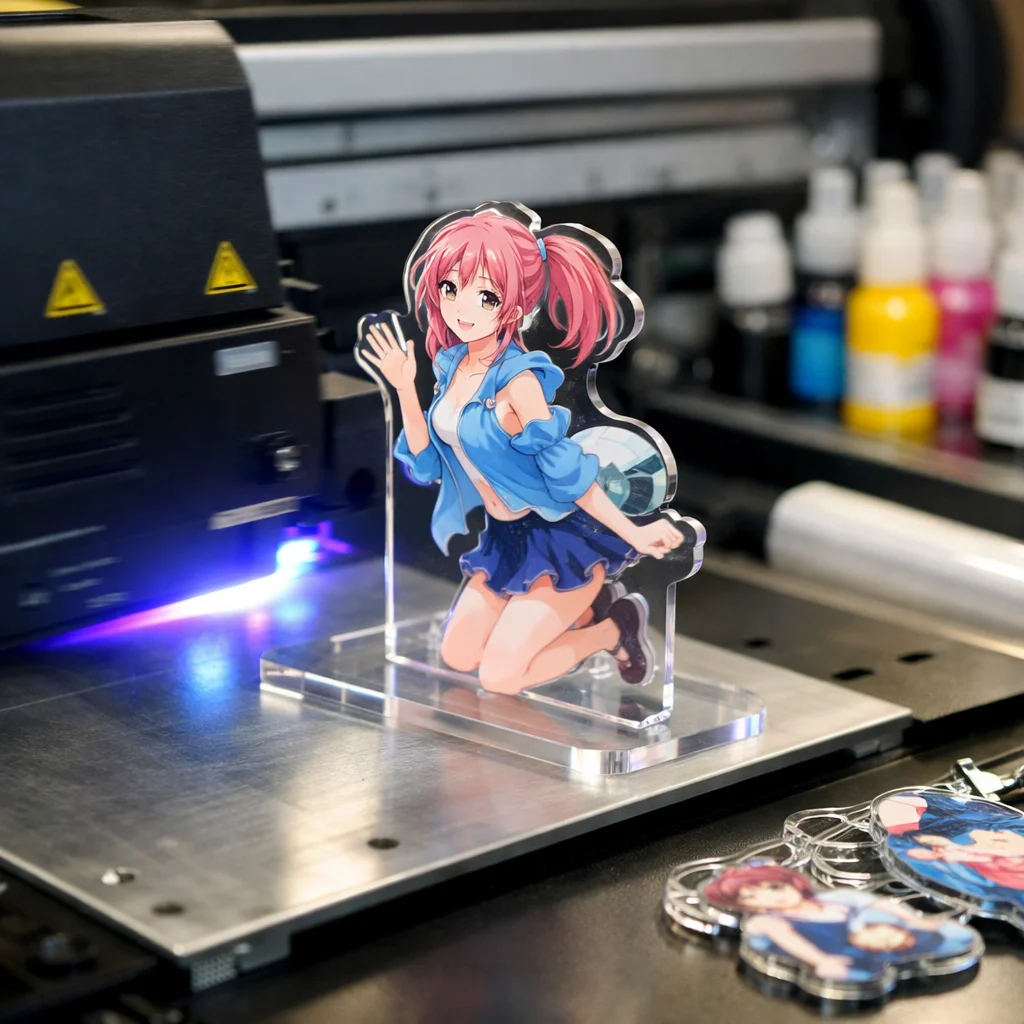 アクリルグッズの魅力の一つは、その加工の柔軟性です。特に、UV印刷技術を用いることで、アクリルグッズの表面に高精度なデザインや写真を直接印刷することが可能となり、製品の個性を際立たせています。