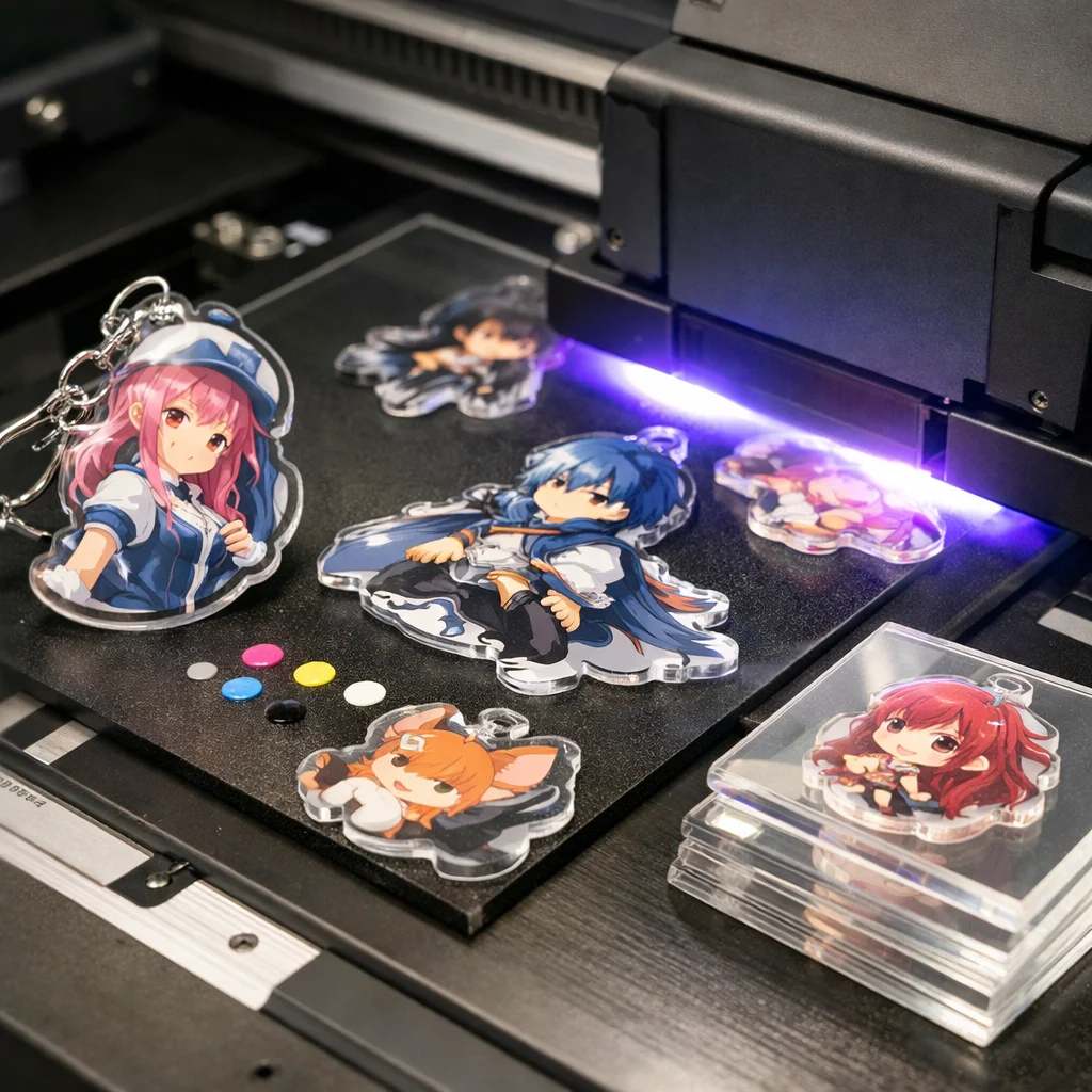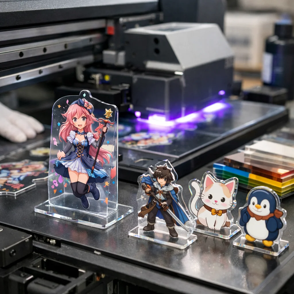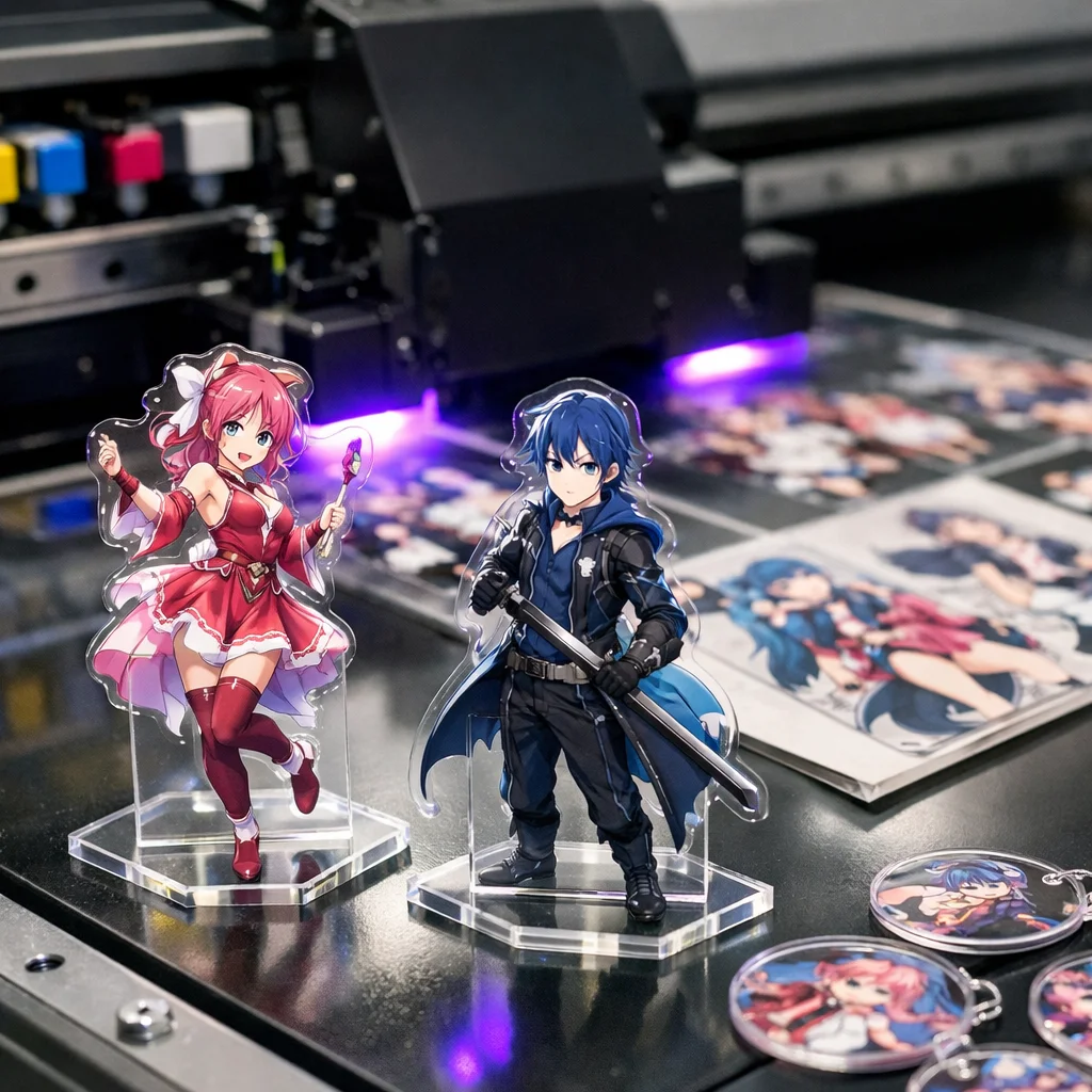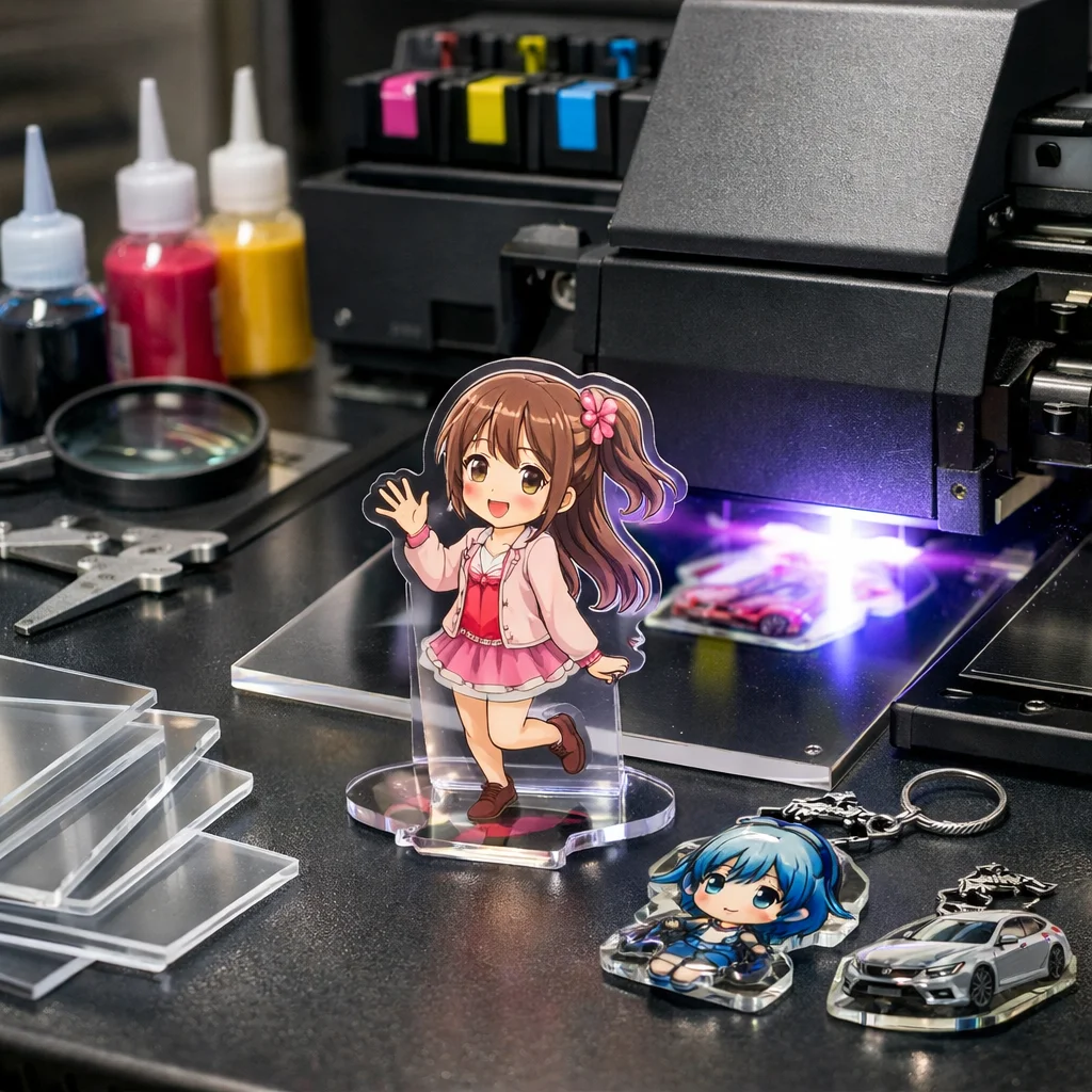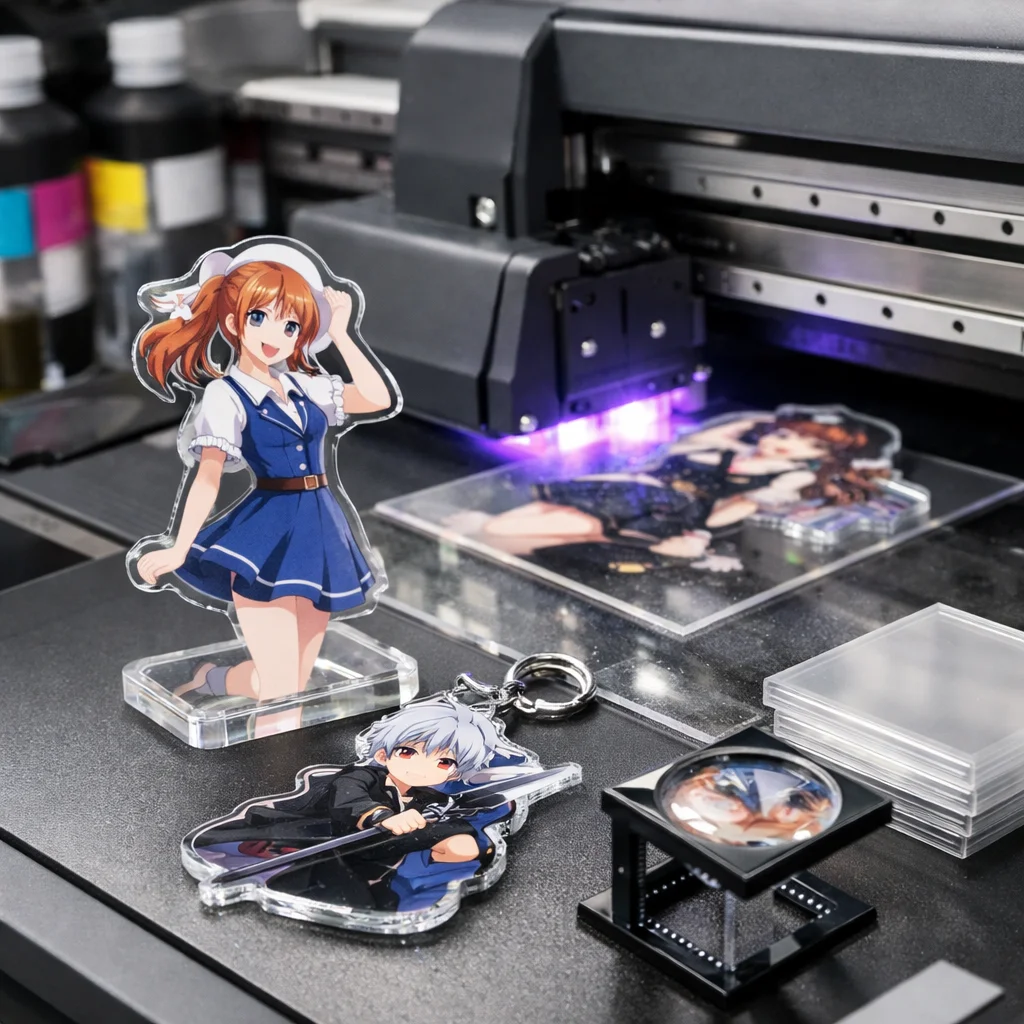 アクリルグッズの魅力の一つは、その加工の柔軟性です。特に、UV印刷技術を用いることで、アクリルグッズの表面に高精度なデザインや写真を直接印刷することが可能となり、製品の個性を際立たせています。