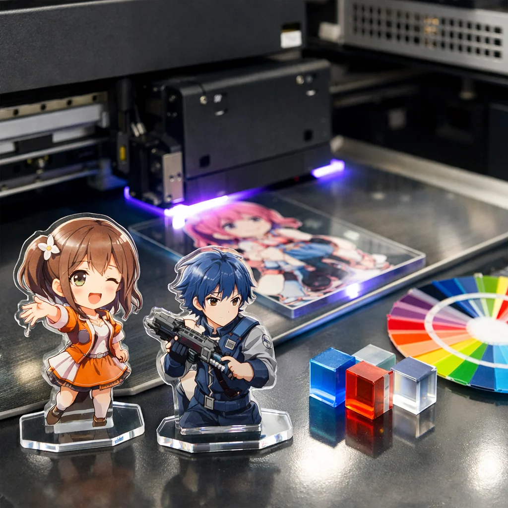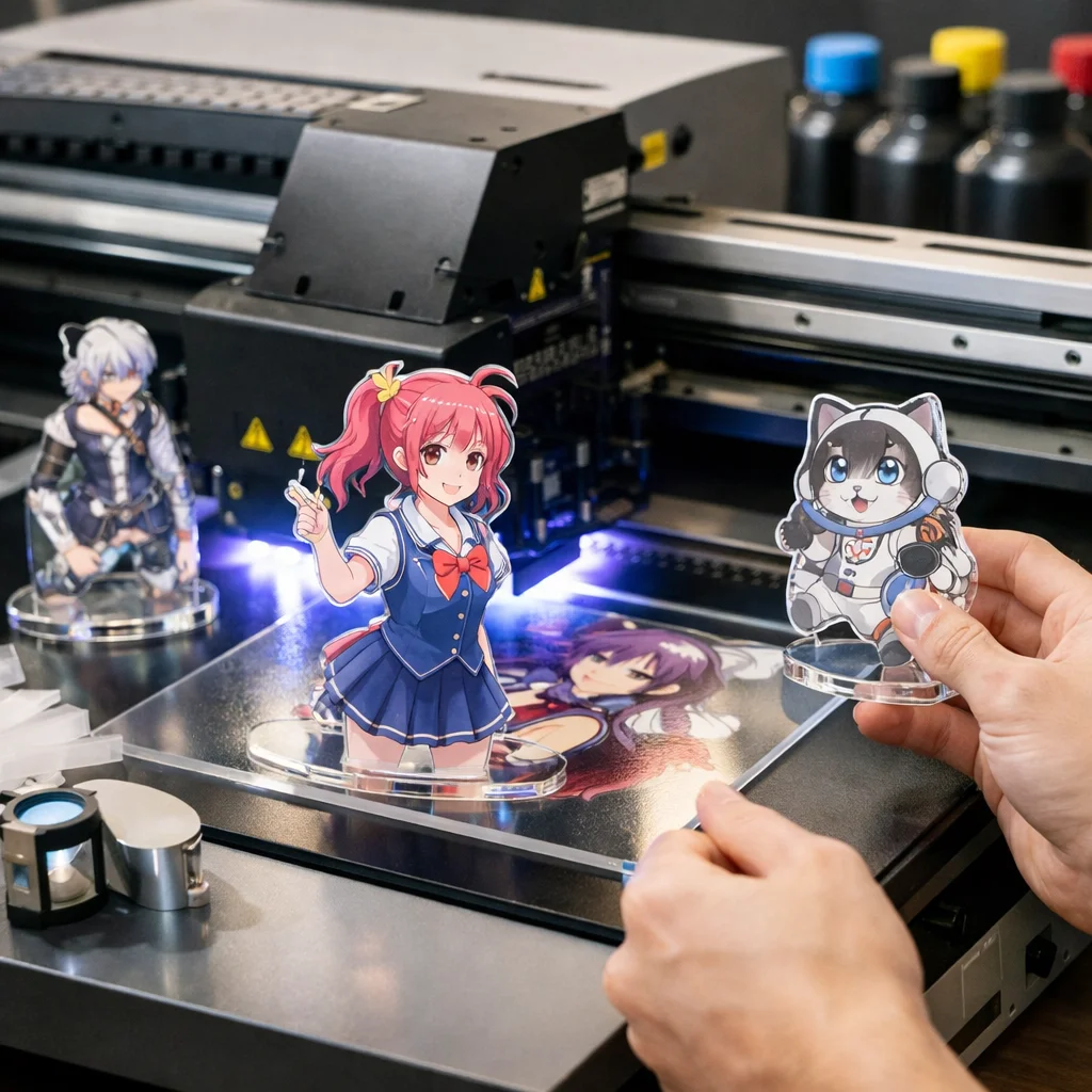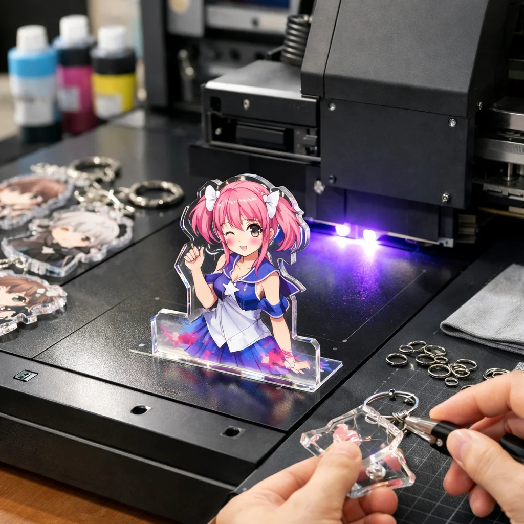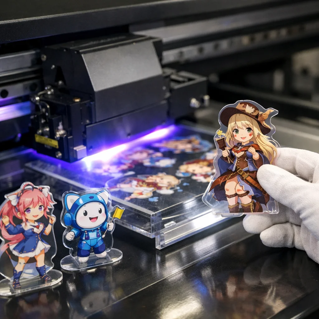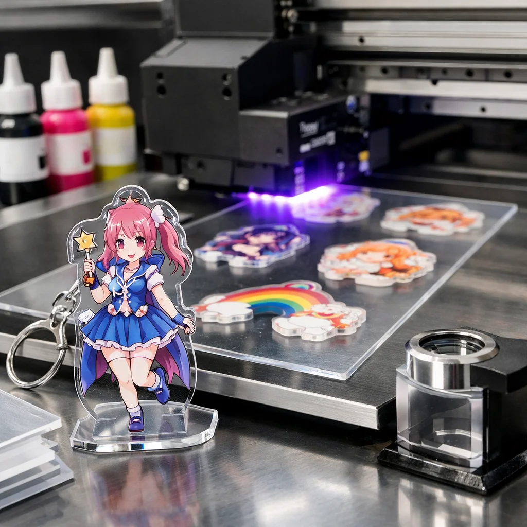 アクリルグッズの魅力の一つは、その加工の柔軟性です。特に、UV印刷技術を用いることで、アクリルグッズの表面に高精度なデザインや写真を直接印刷することが可能となり、製品の個性を際立たせています。