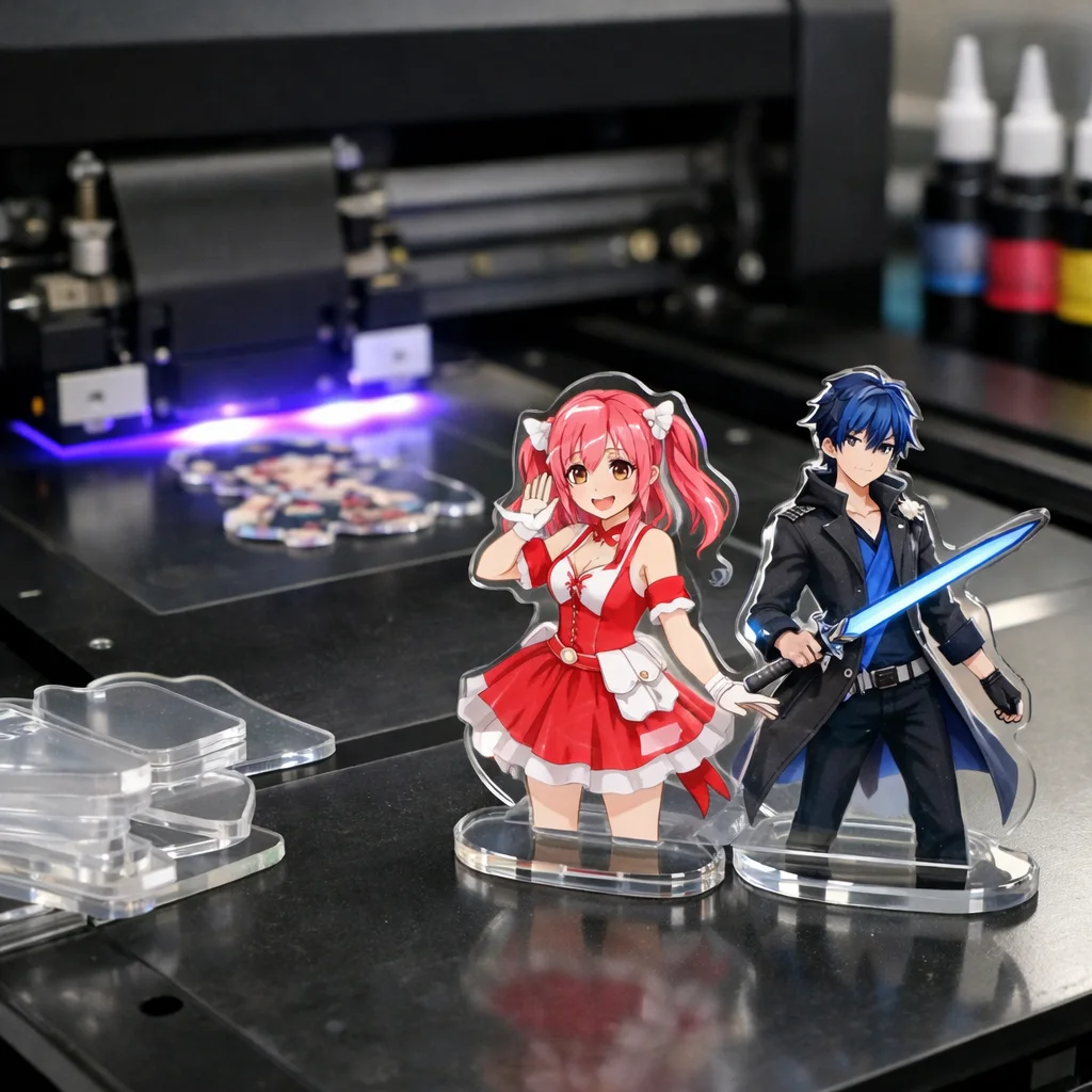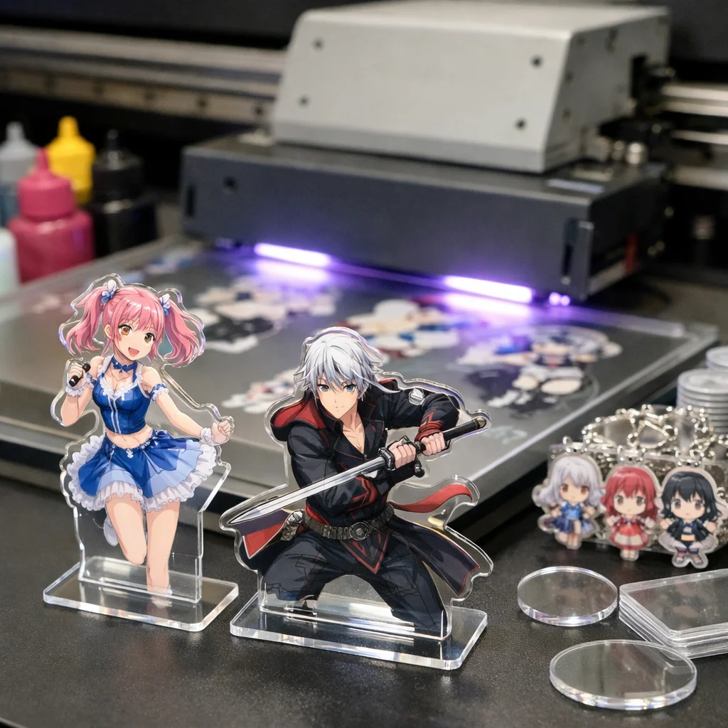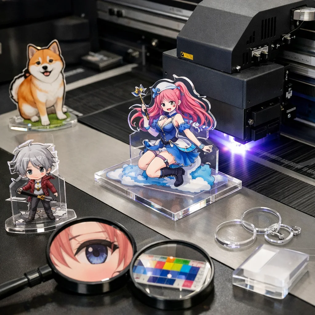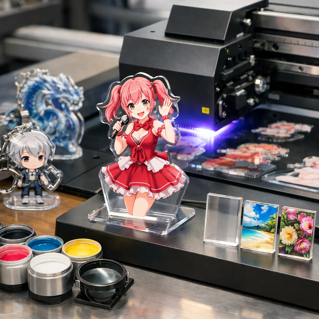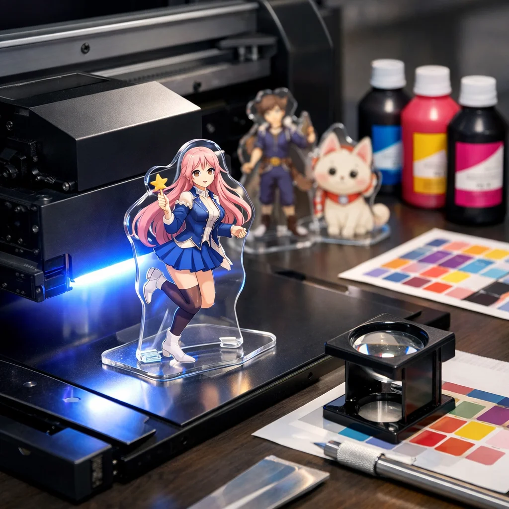 アクリルグッズの魅力の一つは、その加工の柔軟性です。特に、UV印刷技術を用いることで、アクリルグッズの表面に高精度なデザインや写真を直接印刷することが可能となり、製品の個性を際立たせています。