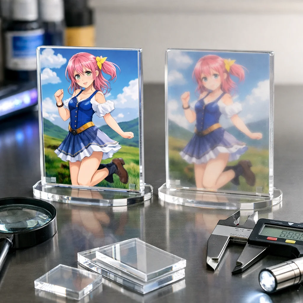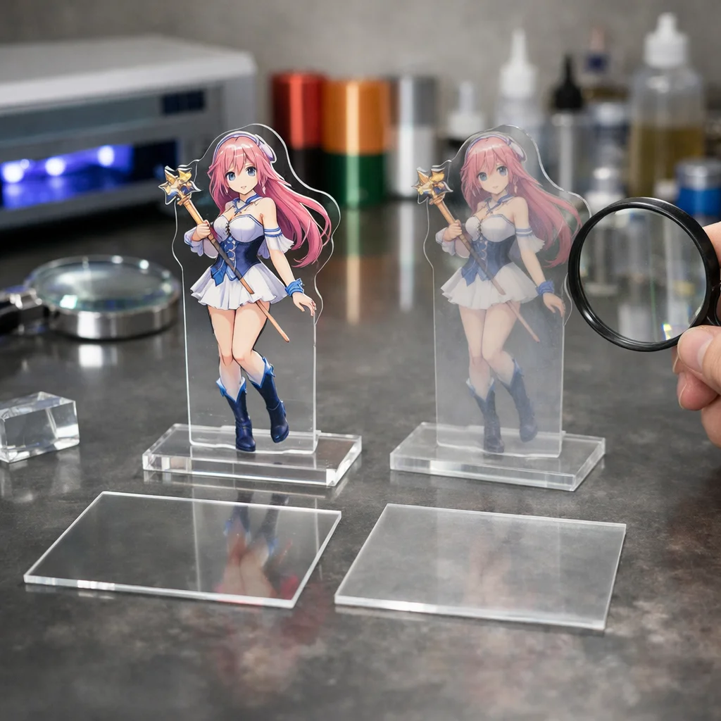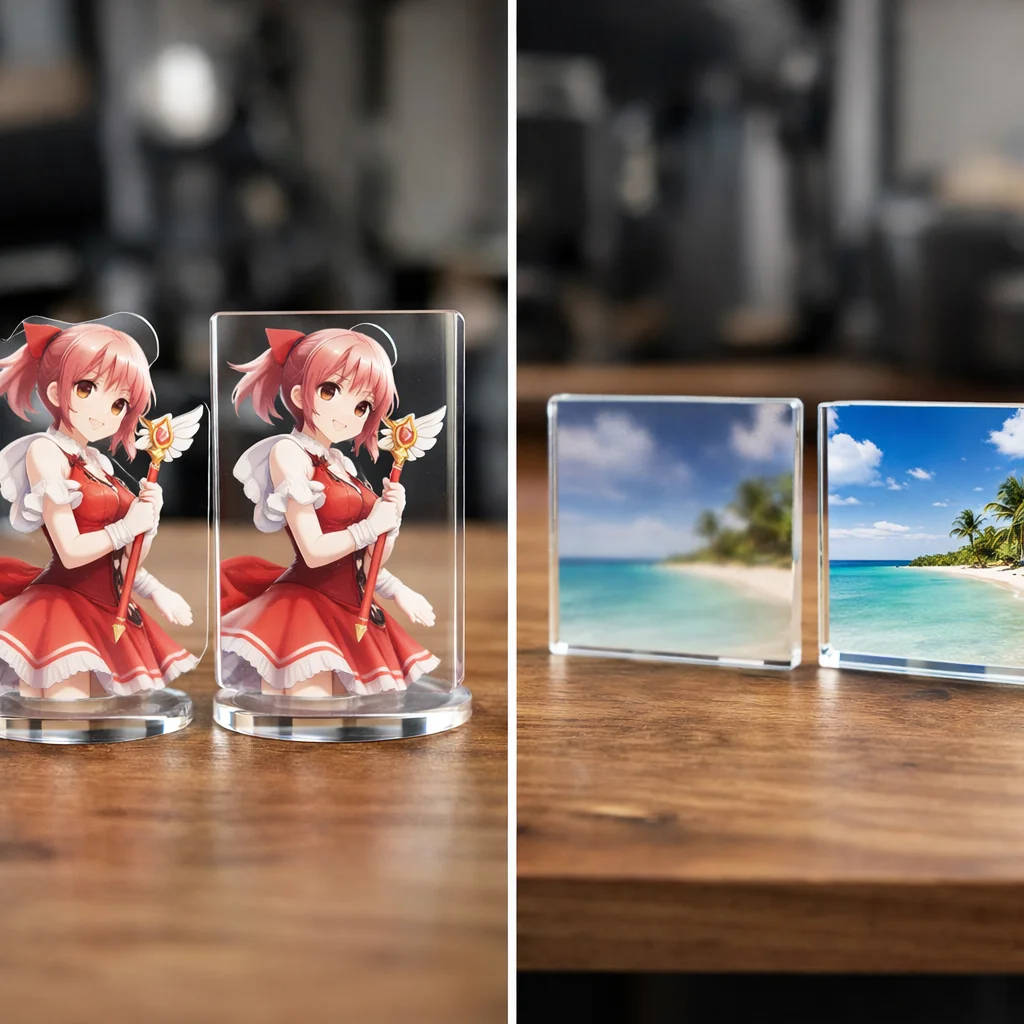 ここから先では、アクリルグッズの加工や印刷技術、コーティングの違い、品質評価について、さらに詳細な比較を行い、どのアクリルグッズがあなたに最適かを明らかにしていきます。アクリルの技術とその利点をしっかりと把握し、最適な作品作りに活かしていきましょう。