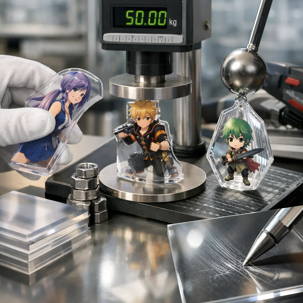 アクリルグッズは、強度や耐久性を評価するために多様なテストが行われます。主なテストには、落下、振動、擦過、引張、ねじりが含まれ、製品特性に合わせた設計が重要です。