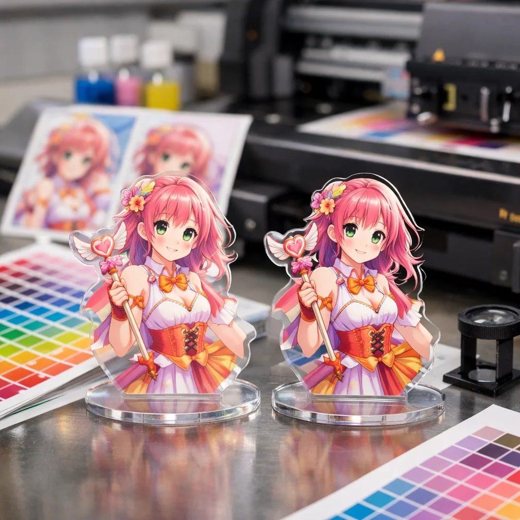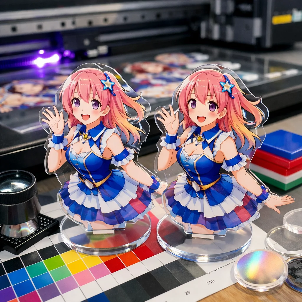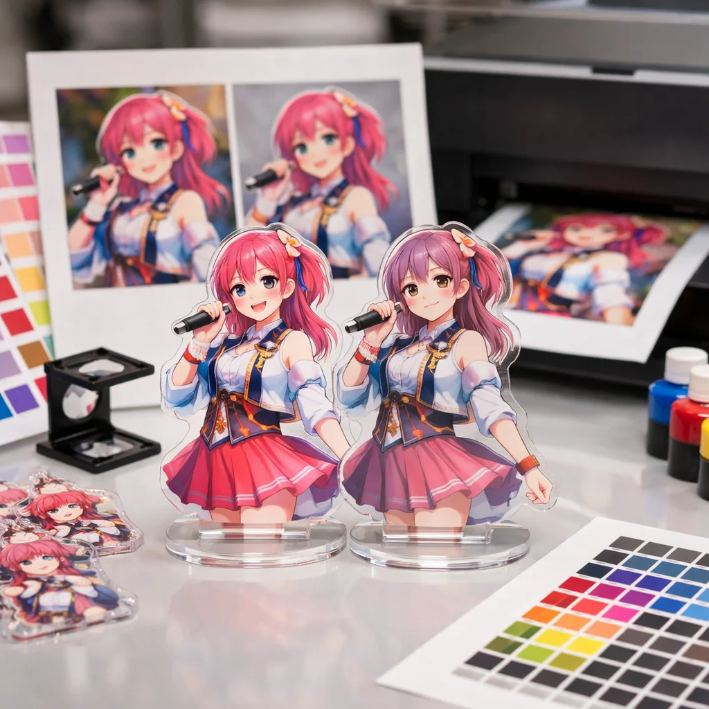 まず、アクリルグッズにおける印刷技術の進化を見てみましょう。従来の印刷方法では、使用するインクの色味が不安定で、デザインの解像度が低いため、最終的な製品の見栄えが損なわれることがありました。しかし現在の技術では、様々なインクの種類が選択可能で、プリンターの解像度も高くなっています。特に、白版制御が進化した結果、アクリルの特性を活かした鮮やかな色彩が可能になりました。