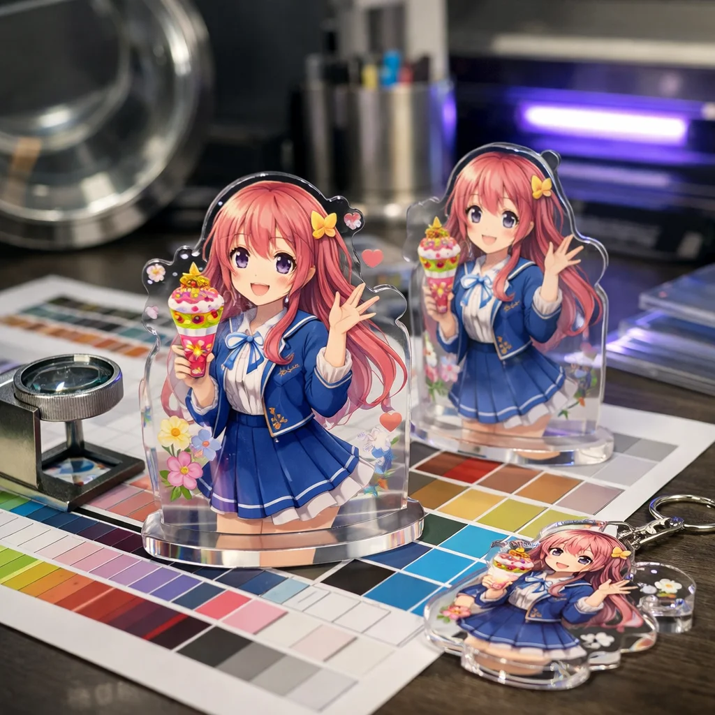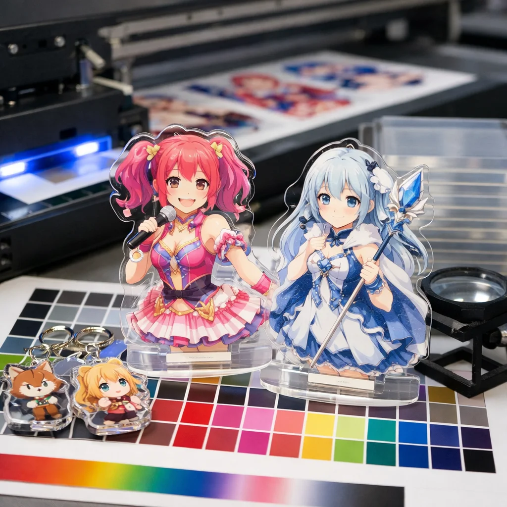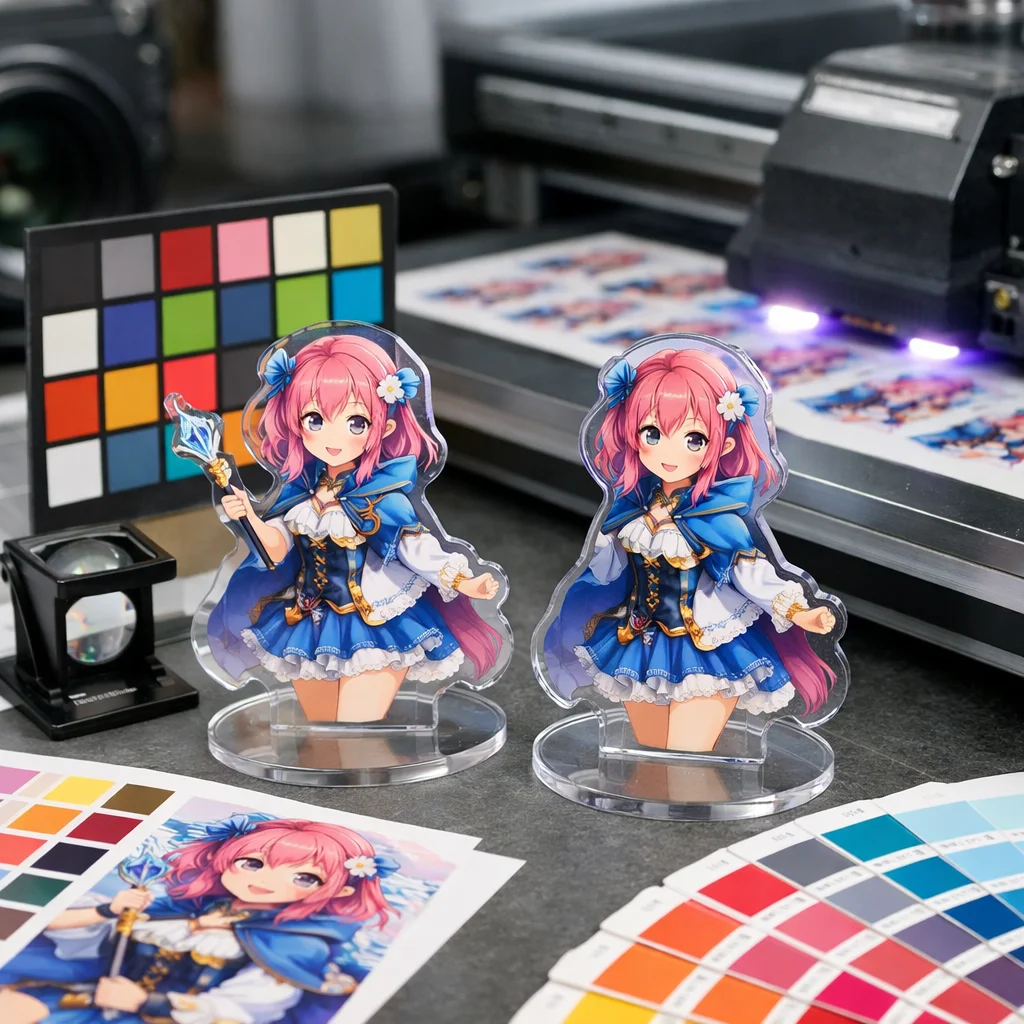 まず、アクリルグッズにおける印刷技術の進化を見てみましょう。従来の印刷方法では、使用するインクの色味が不安定で、デザインの解像度が低いため、最終的な製品の見栄えが損なわれることがありました。しかし現在の技術では、様々なインクの種類が選択可能で、プリンターの解像度も高くなっています。特に、白版制御が進化した結果、アクリルの特性を活かした鮮やかな色彩が可能になりました。
