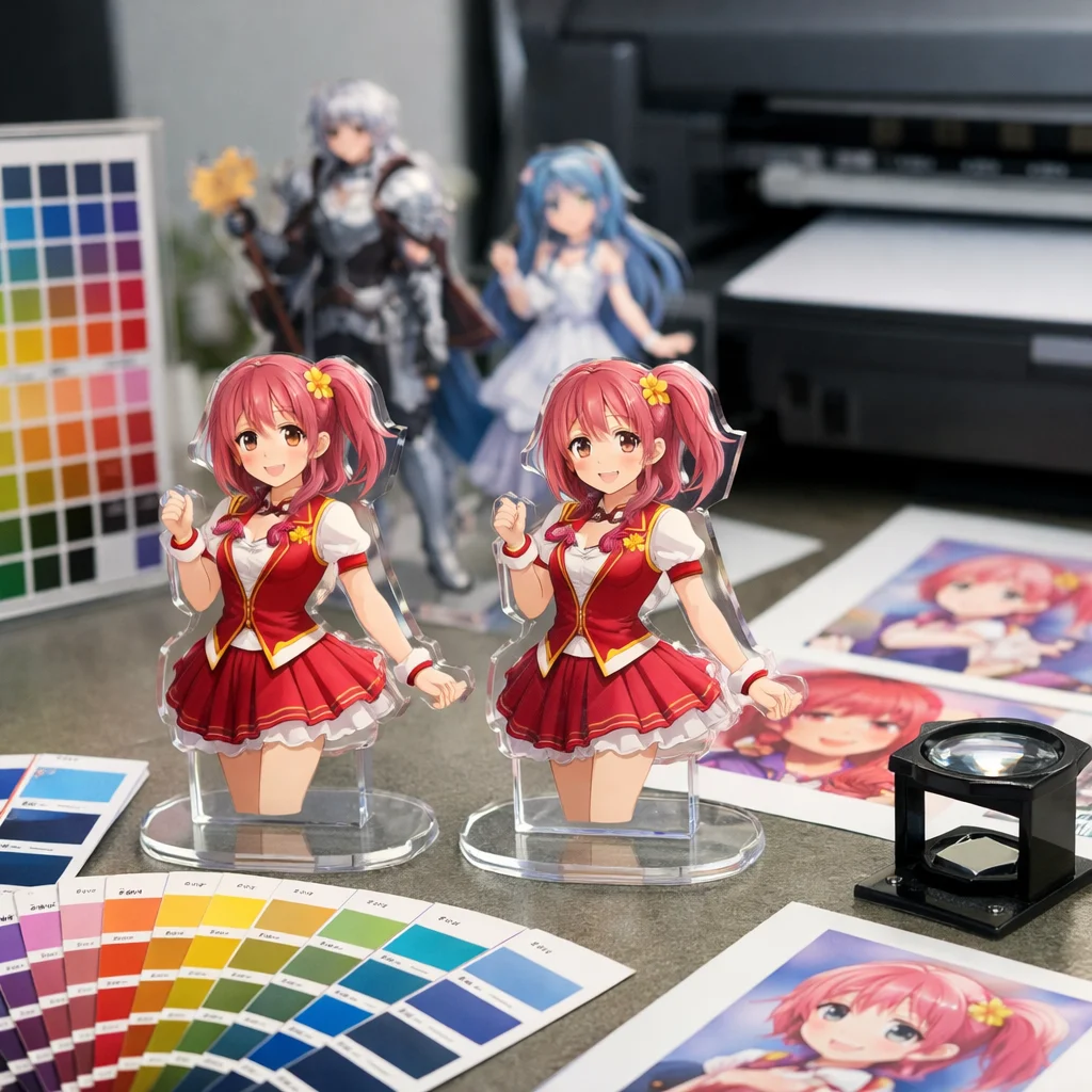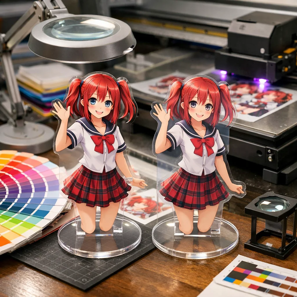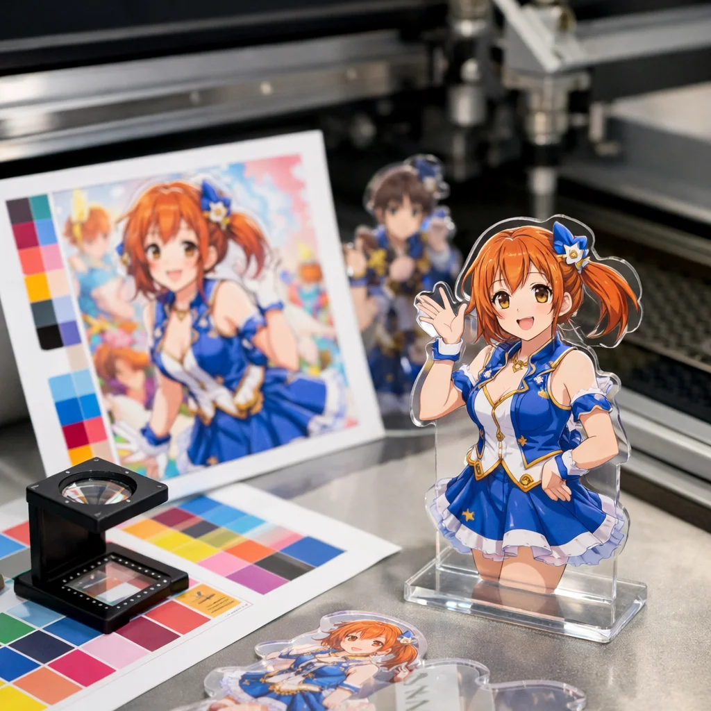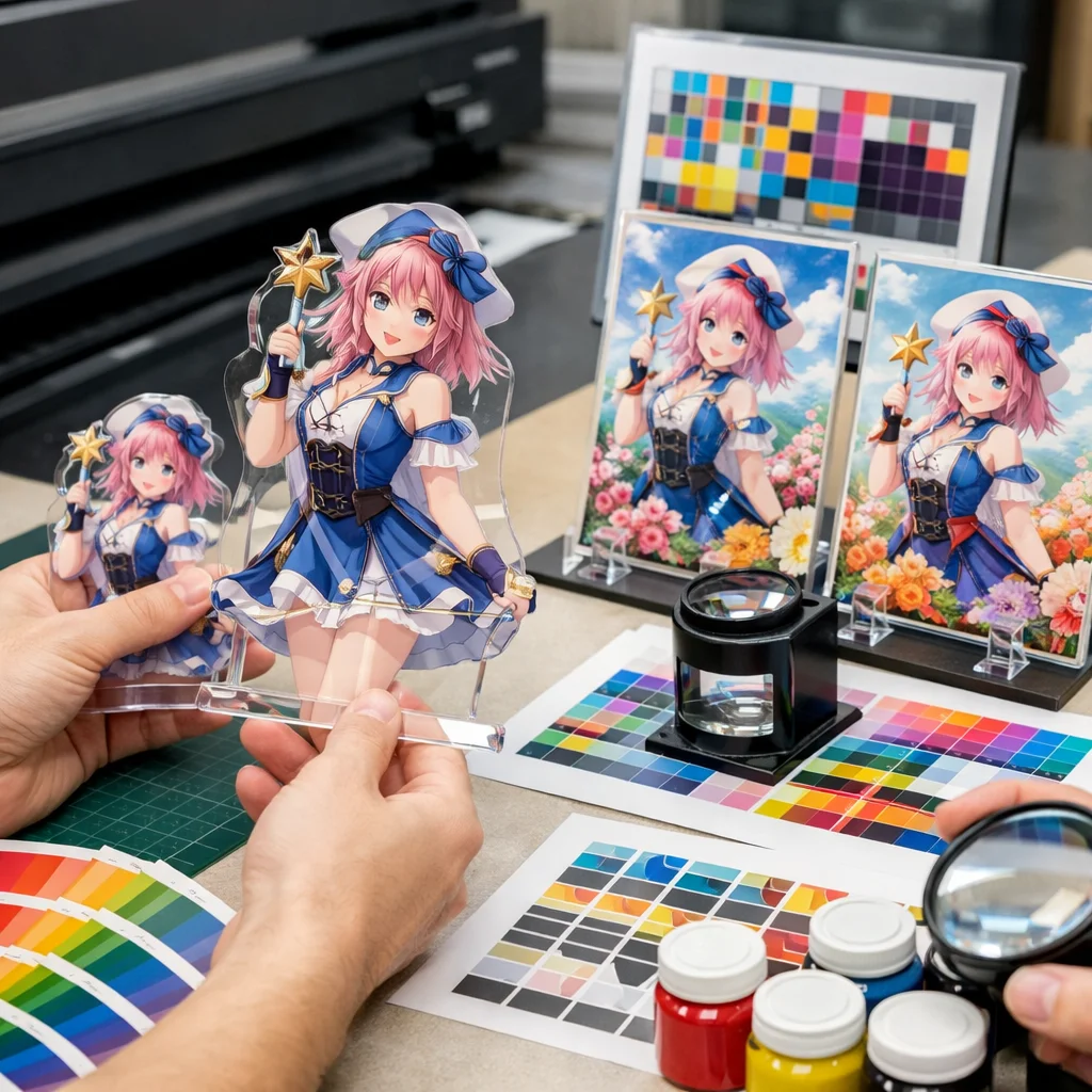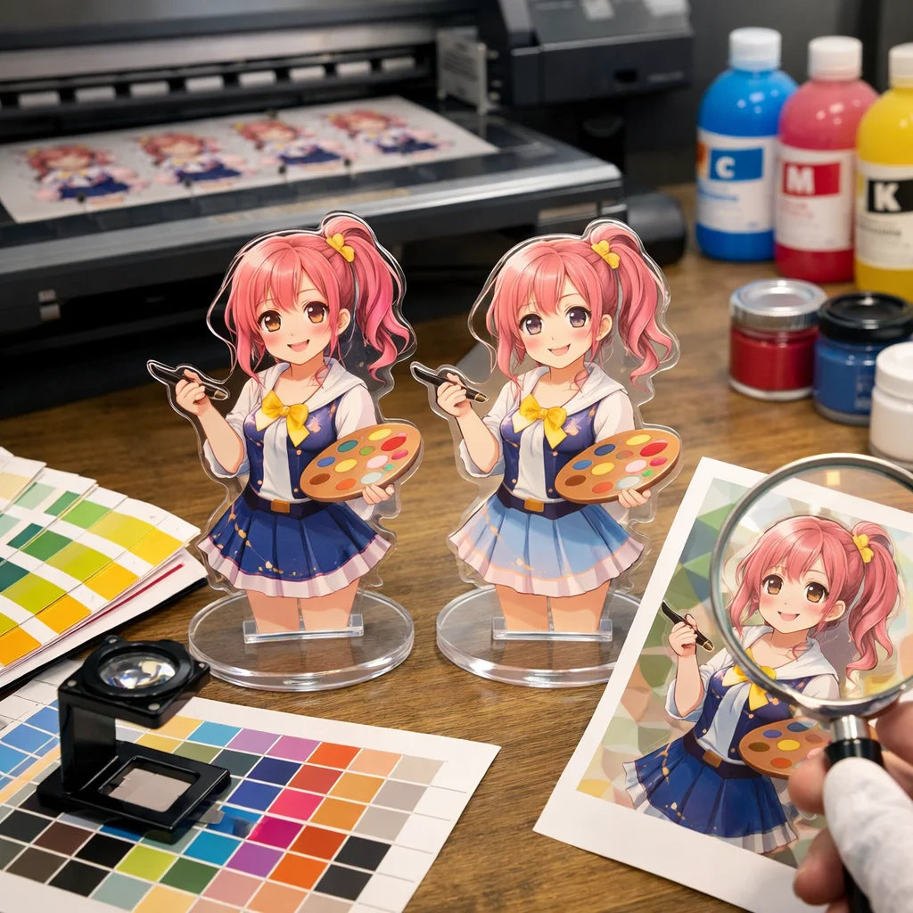 アクリルグッズの作成において、色校は非常に重要です。早期に色校を取り、実物と比較しながら調整を行うことが大切です。これにより、最終的な色味の忠実度を高めることができます。