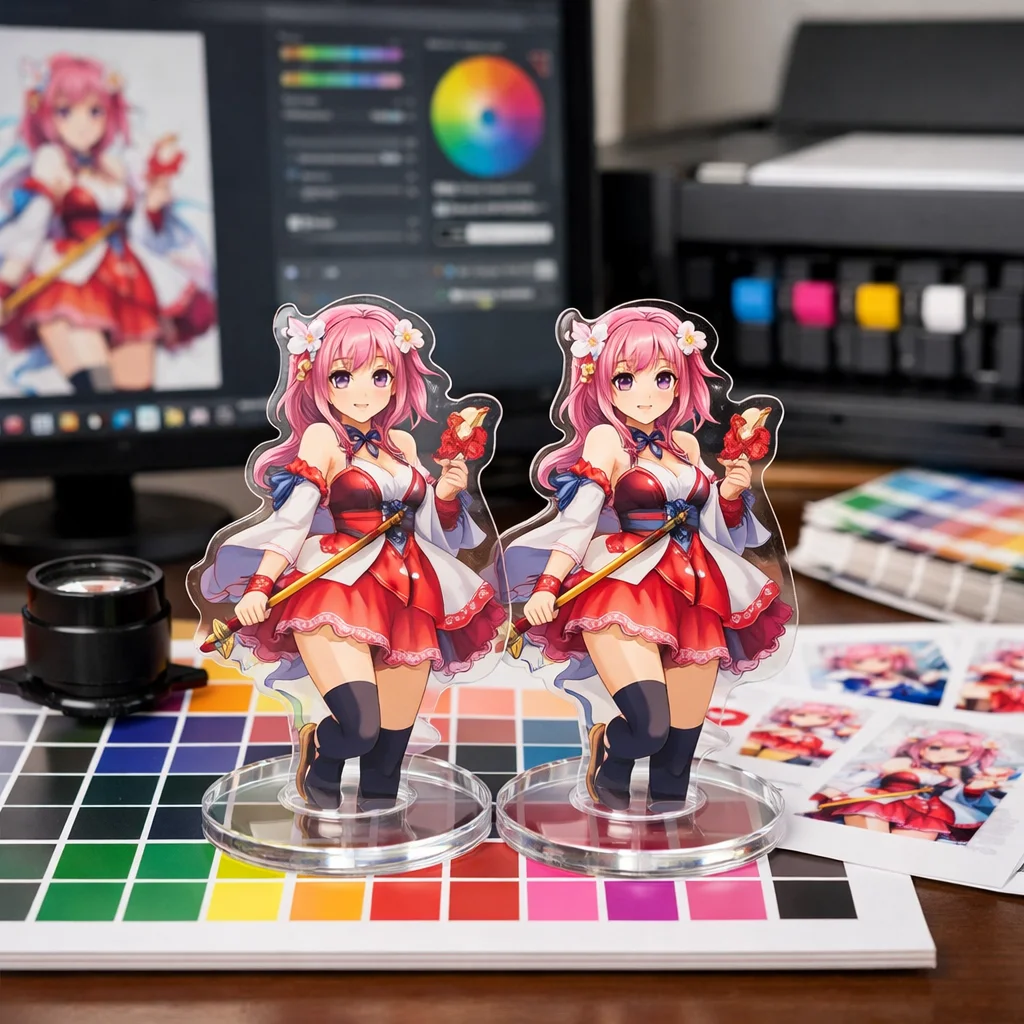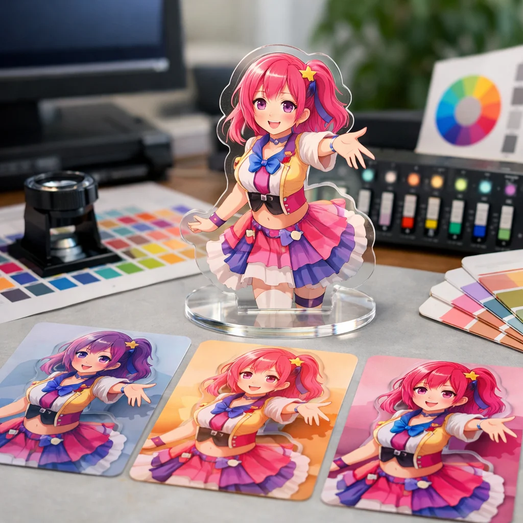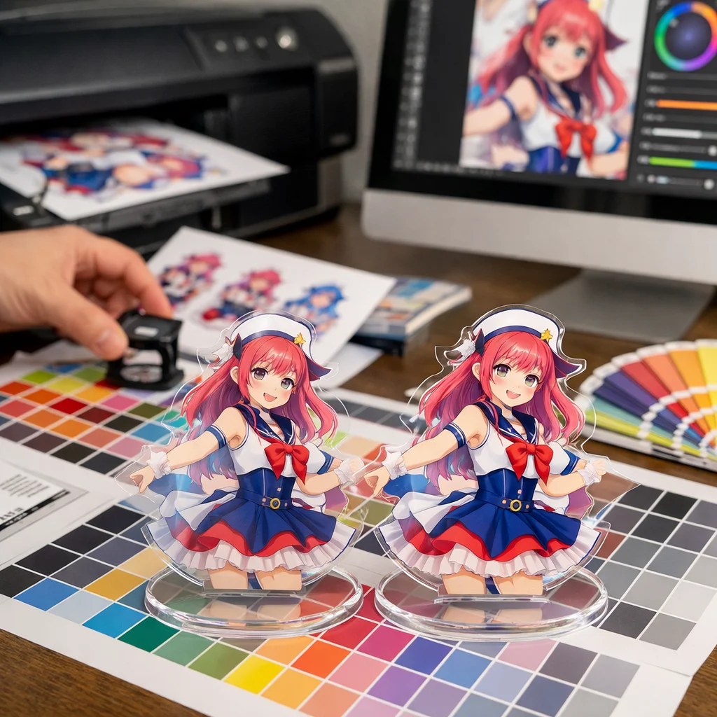 このようなズレを避けるためには、色味調整を単に印刷所任せにしないための設計作業が必要です。色研修を受け、色見本を用意したり、プロトタイプを作成して確認したりすることで、アクリルグッズの色味が期待通りに再現できるようになります。その結果、最終的な製品がより魅力的で、顧客にとって満足のいくものになるのです。