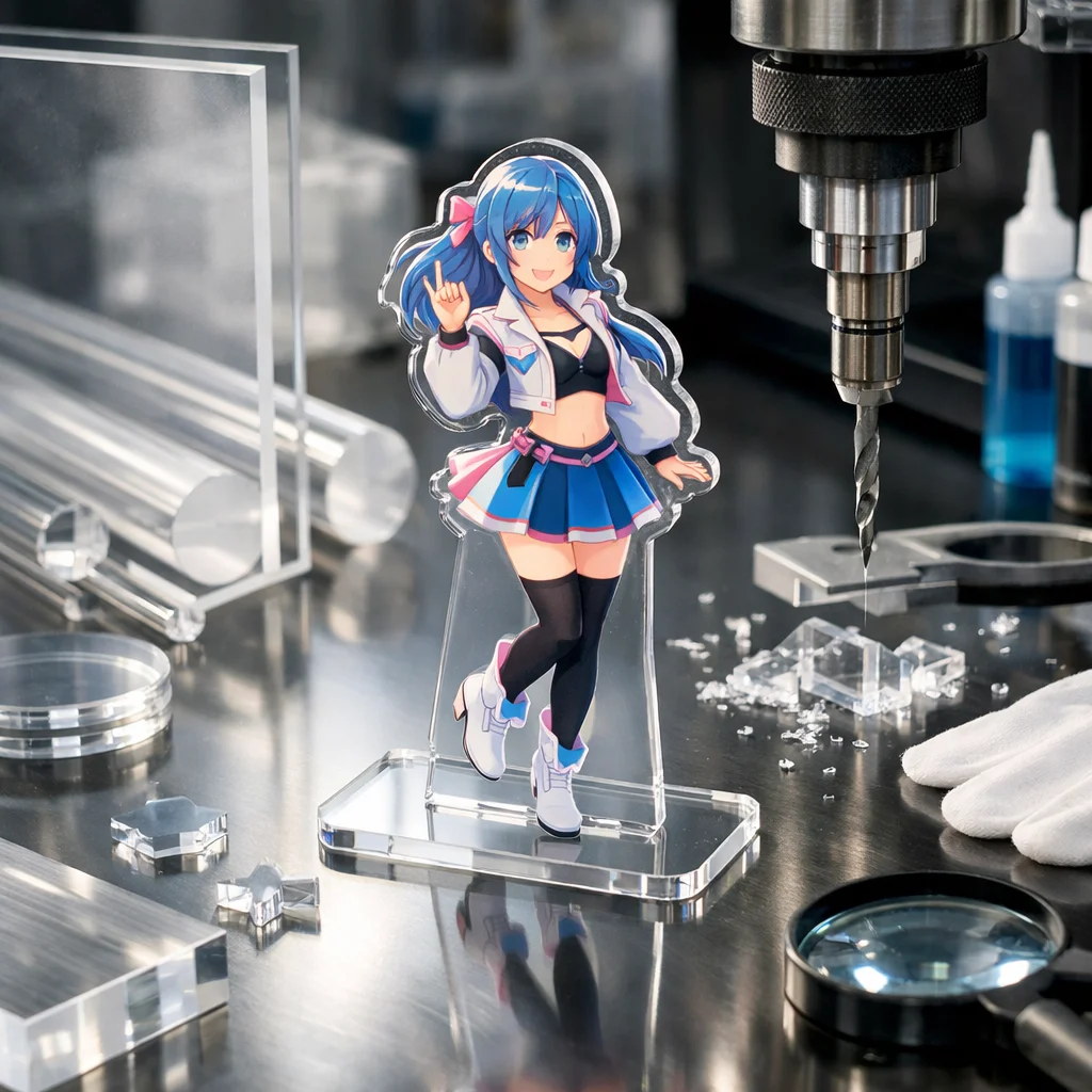 アクリルグッズの製造には、アクリルの透明性を最大限に活かすための高度な技術が求められます。例えば、アクリルの切削加工では、透明な仕上がりを実現するために、専用の工具や加工条件の最適化が必要です。これにより、アクリルグッズの表面が滑らかで美しい透明感を保つことができます。