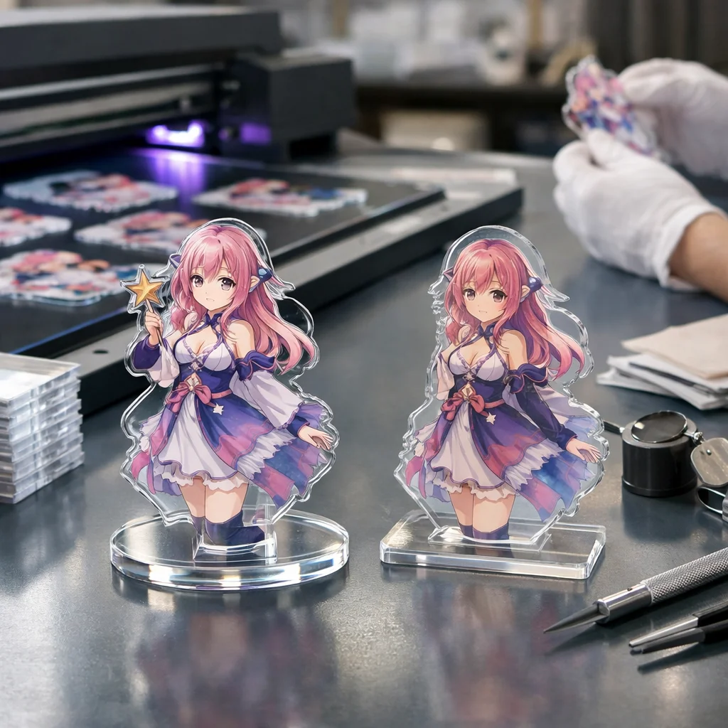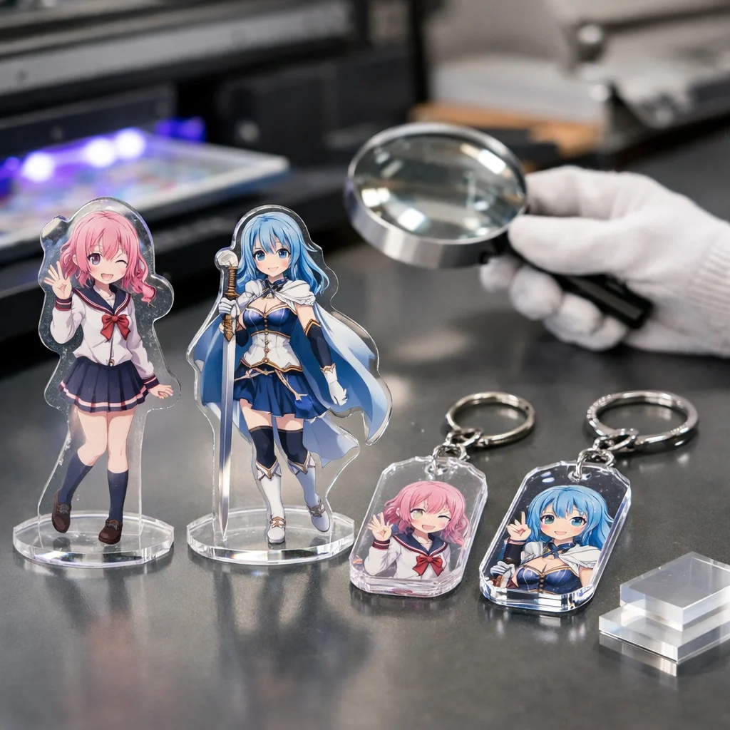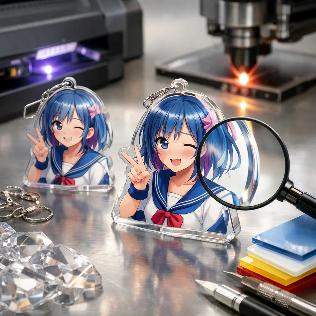印刷の精細さも重要な評価基準です。特にオリジナルデザインを求める制作担当や同人・法人発注者にとって、細かいデザインが鮮明に再現されるかどうかは重要です。高品質なアクリルグッズは、鮮やかで詳細な印刷が施され、まさに原画そのものを体現します。