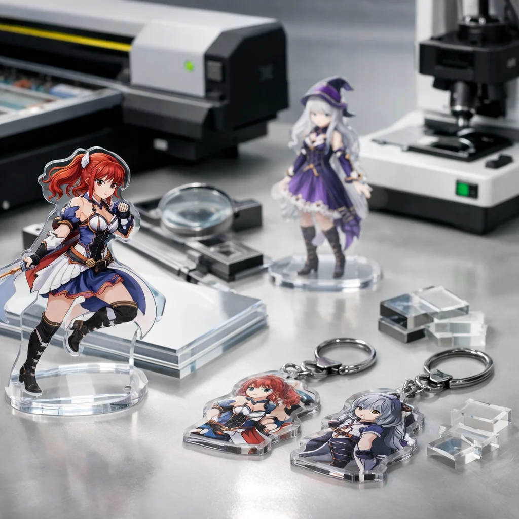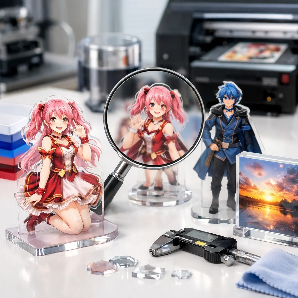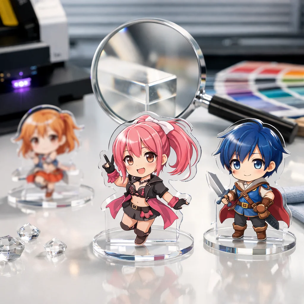 印刷の精細さも重要な評価基準です。特にオリジナルデザインを求める制作担当や同人・法人発注者にとって、細かいデザインが鮮明に再現されるかどうかは重要です。高品質なアクリルグッズは、鮮やかで詳細な印刷が施され、まさに原画そのものを体現します。