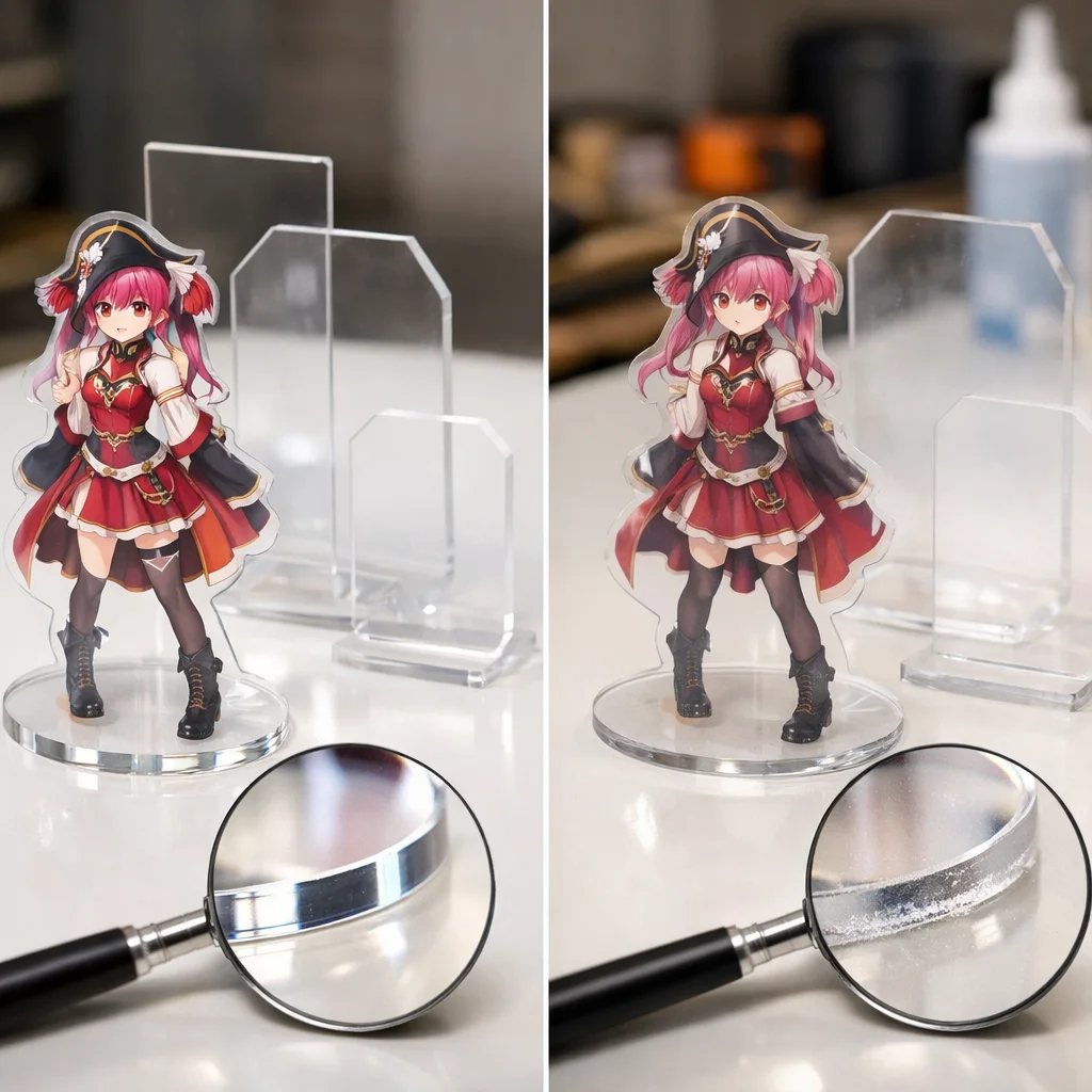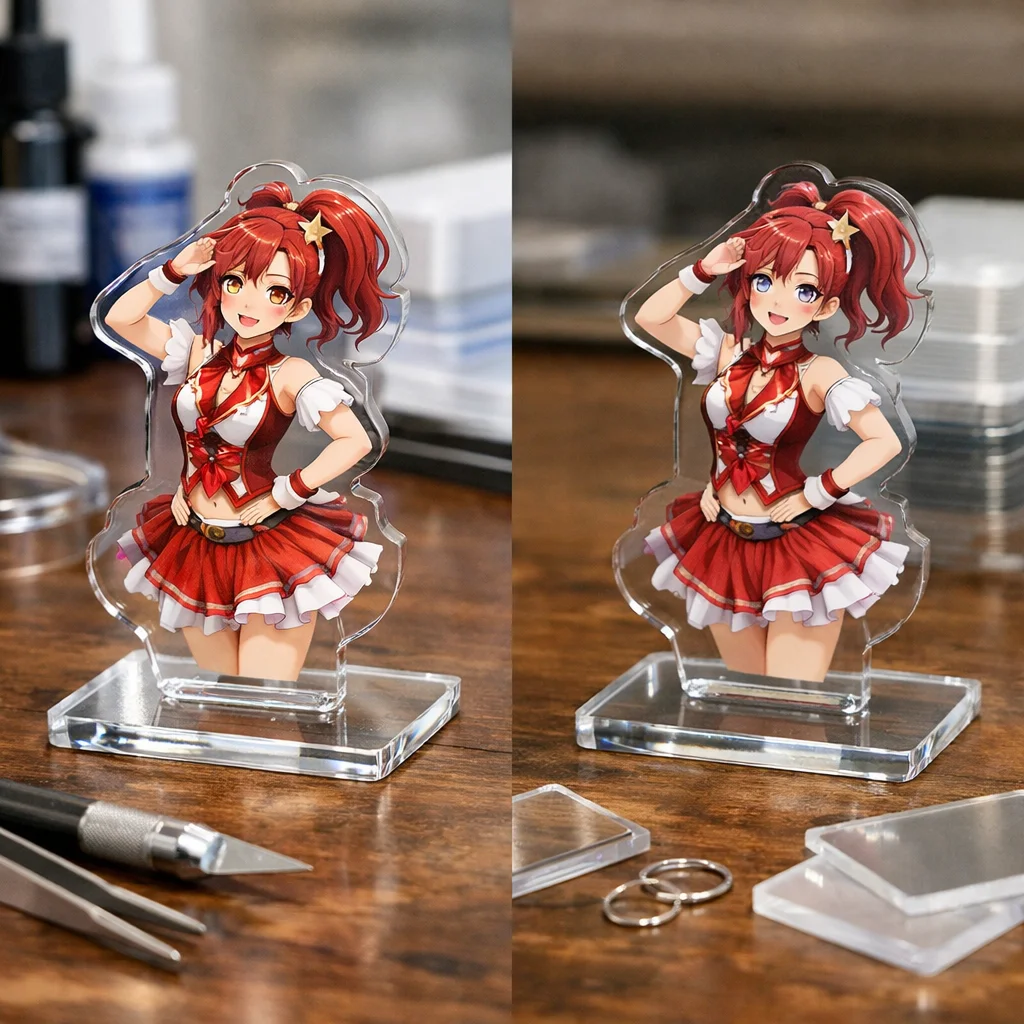 まず、高品質なアクリルグッズの最も明確な指標の一つは、その透明感です。高透明度を持つアクリルグッズは、光をきれいに通し、色が鮮やかに映えます。一般的な低品質の製品は、色に濁りが見られることが多く、これは主に素材の不純物が原因で、視覚的な美しさを損なう要因となります。光に透かしてみると、その透明感の違いが分かりやすく確認できます。
