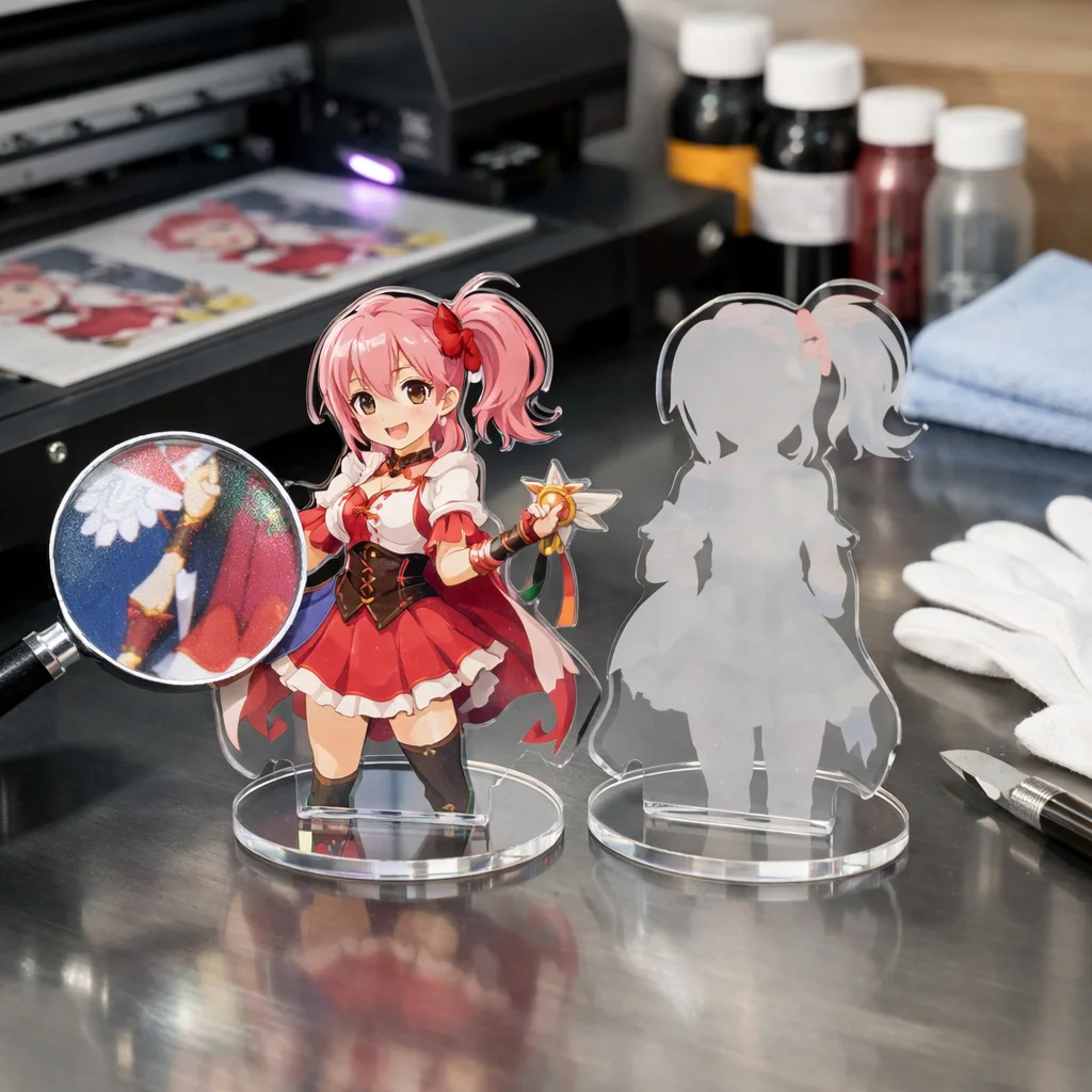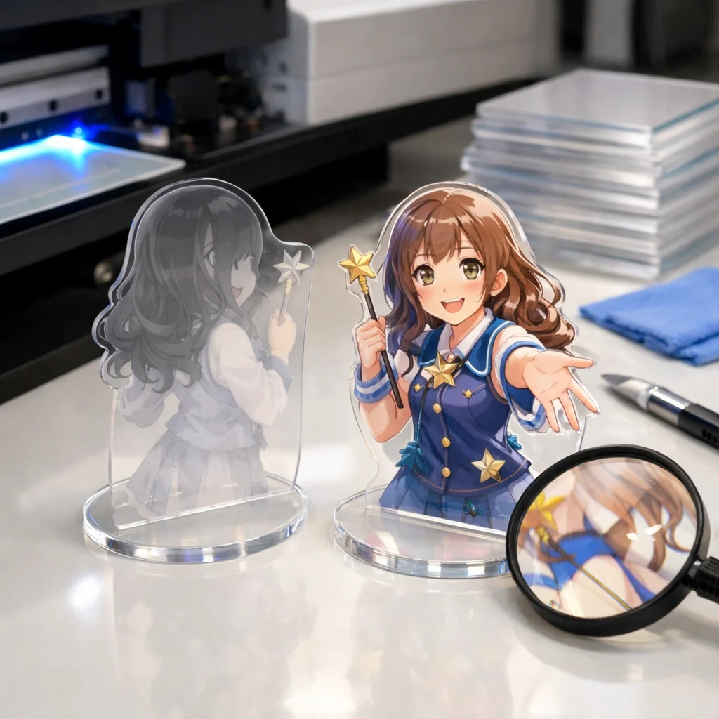 まず、アクリル印刷における表現の進化は、主に解像度の向上と白版制御の精度向上によって実現されました。高解像度の印刷技術により、細部の描写が可能になり、多彩な色合いを持つデザインが再現できます。また、白版制御の改善により、透明なアクリルグッズの上に色を乗せる際に、下地の色によらず正確に再現されるようになりました。