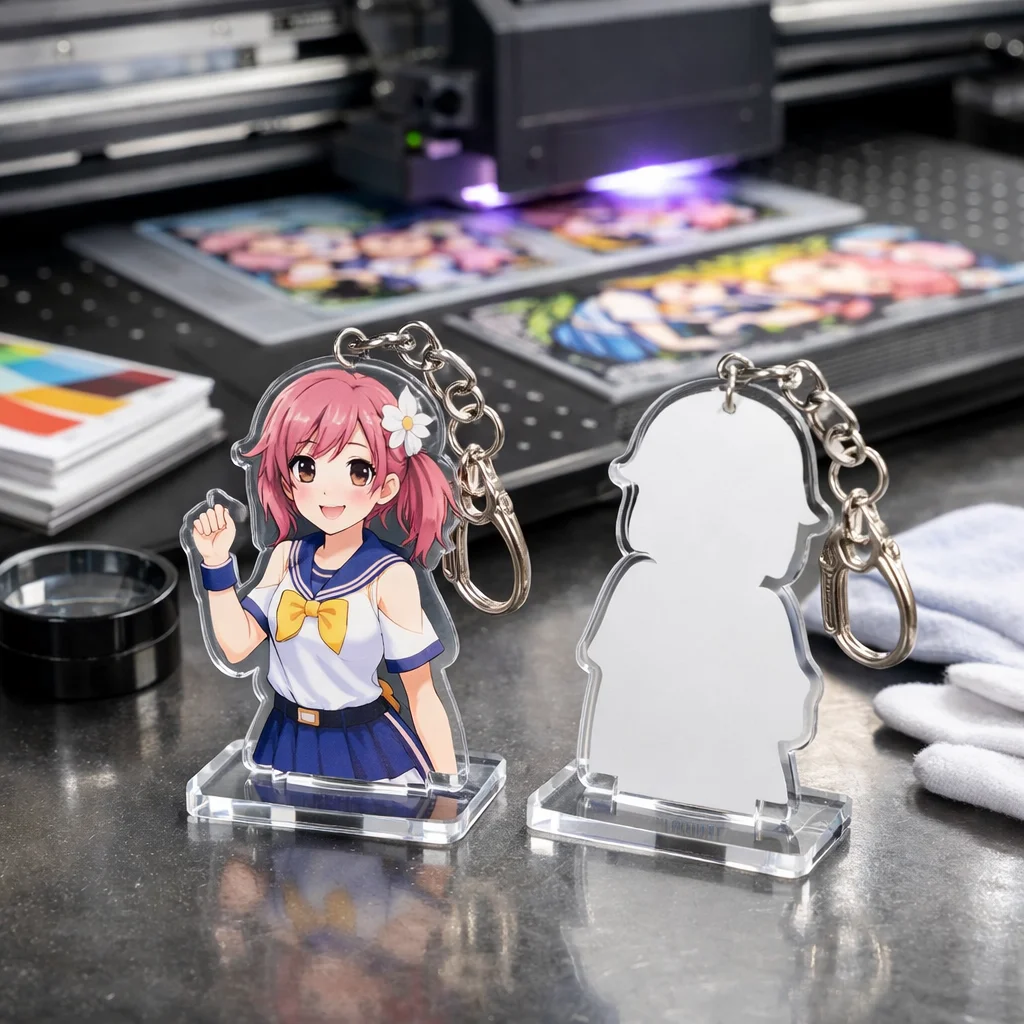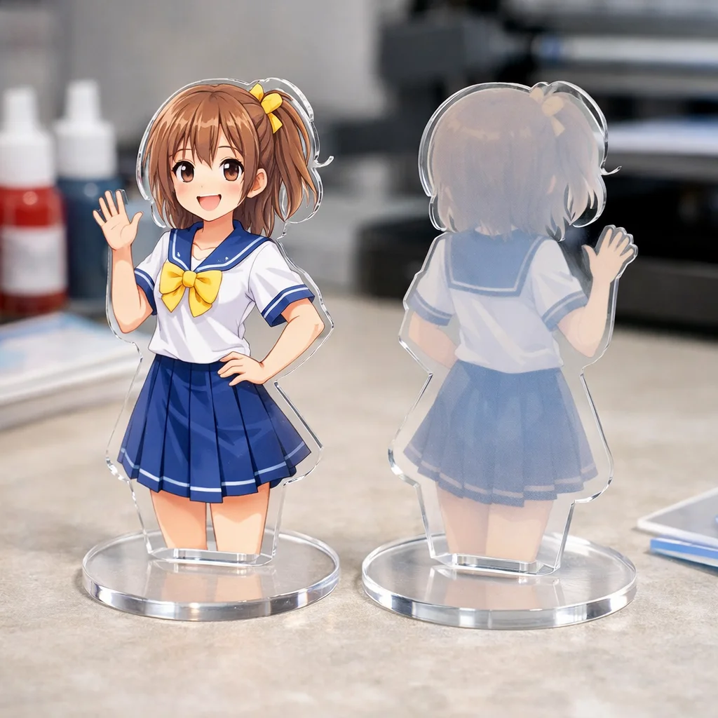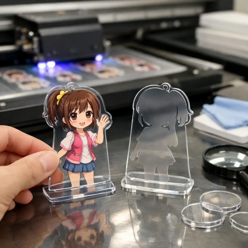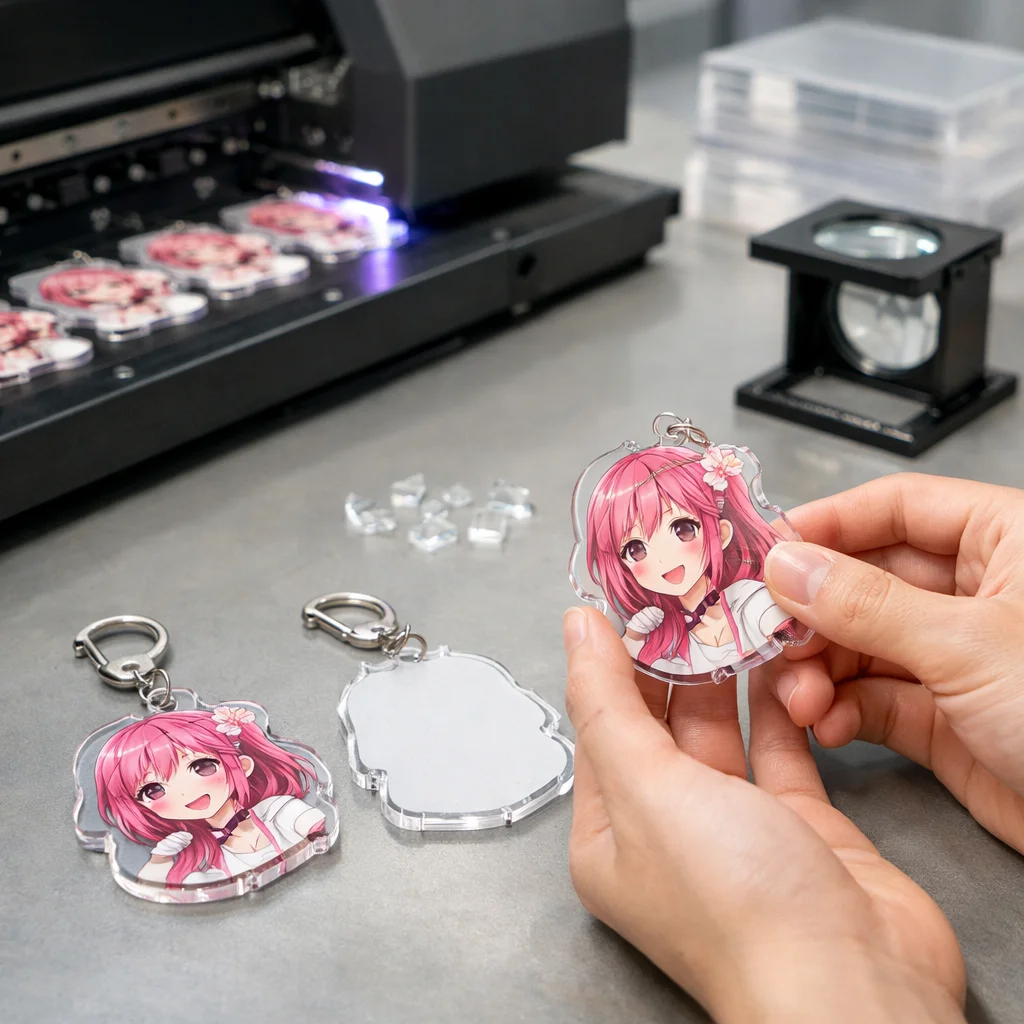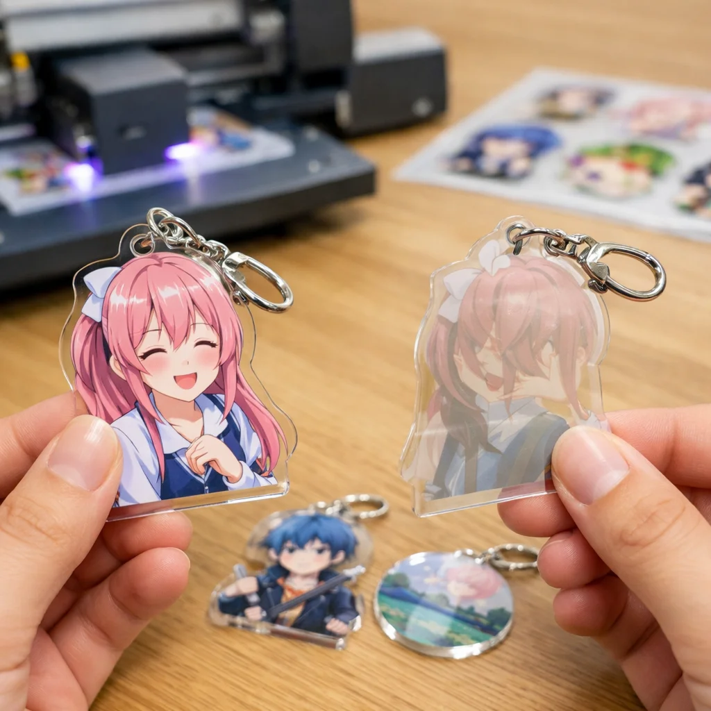 次に、アクリルグッズにおける片面印刷の重要性について考えます。特に小ロット生産やイベント頒布、ノベルティグッズとしての制作において、以下のような役割を果たします。