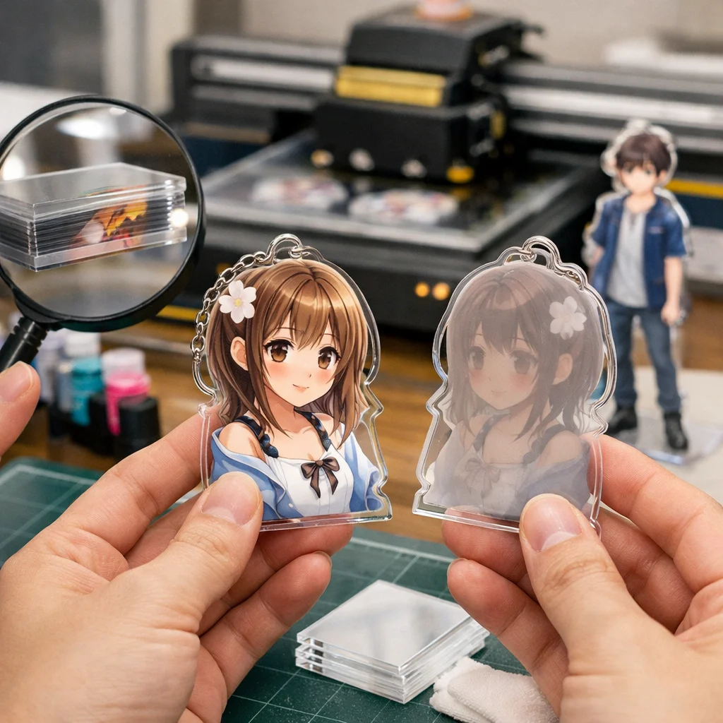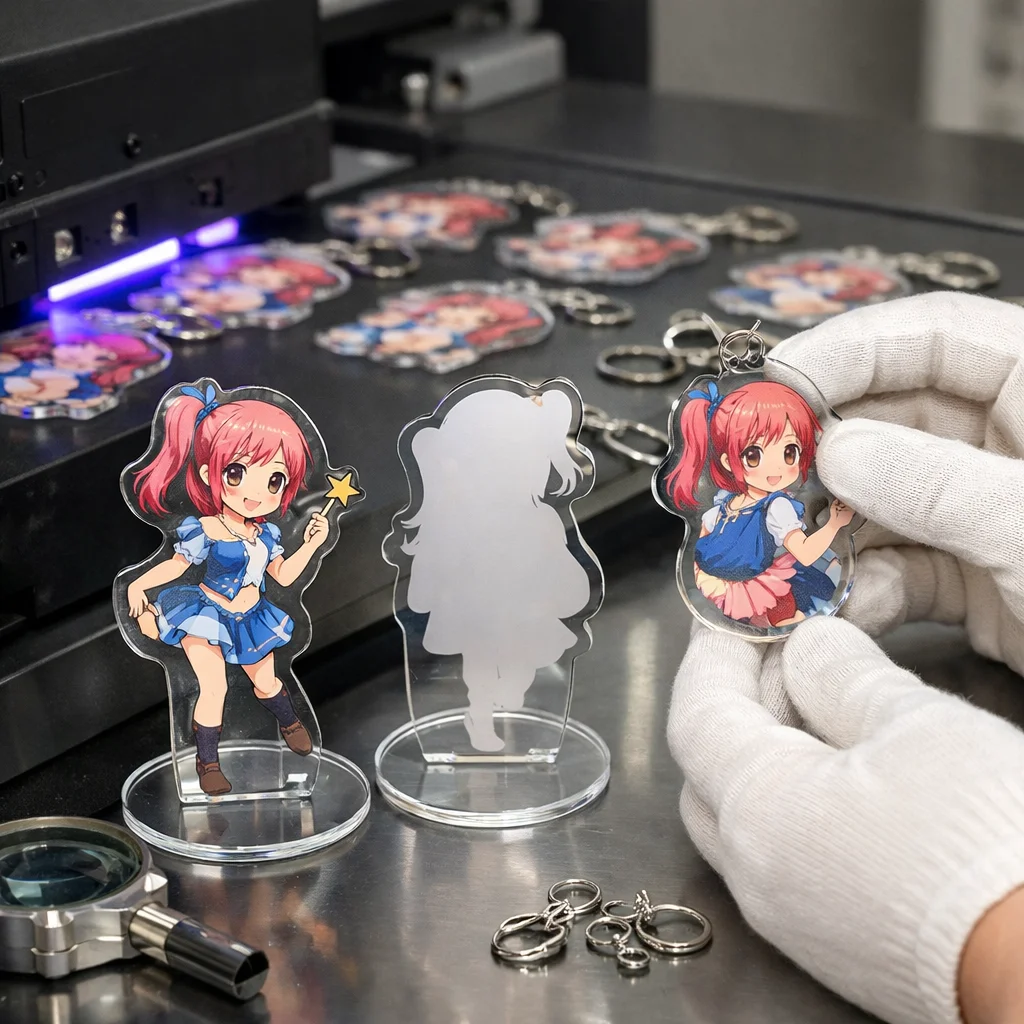 アクリルグッズの片面印刷では、データ受領から個包装まで多くの工程があります。各工程での品質差が発生するため、発注者は校正や色見本の確認が重要です。特に白版ズレや硬化不足、カット面の状態に注意を払い、適切な指定と確認を行うことが高品質な製品を生み出します。