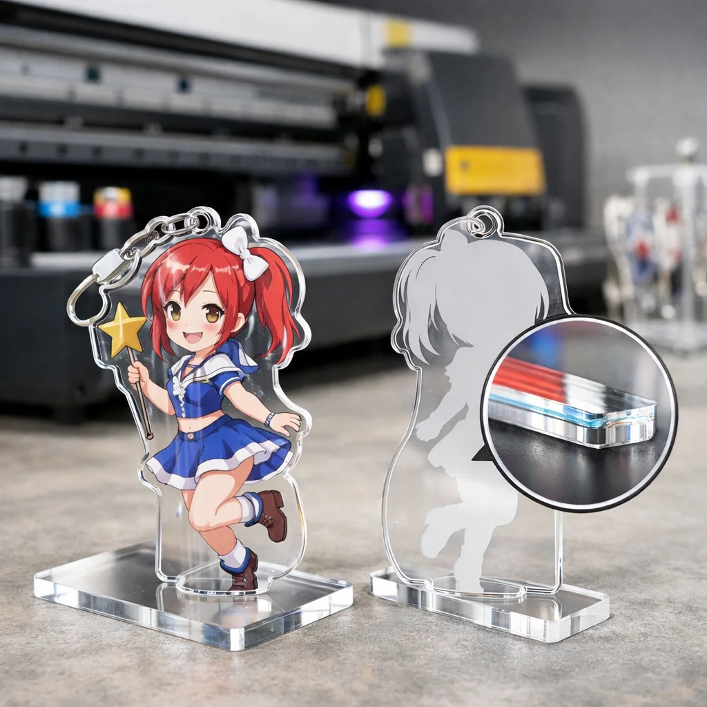 片面印刷のアクリルグッズは、特にコスト面での優位性があります。印刷面が一つで済むため、総印刷コストが抑えられることが大きな利点です。また、作品の雰囲気づくりにも適しており、裏面の透明感が作品を引き立てる場合も多いです。