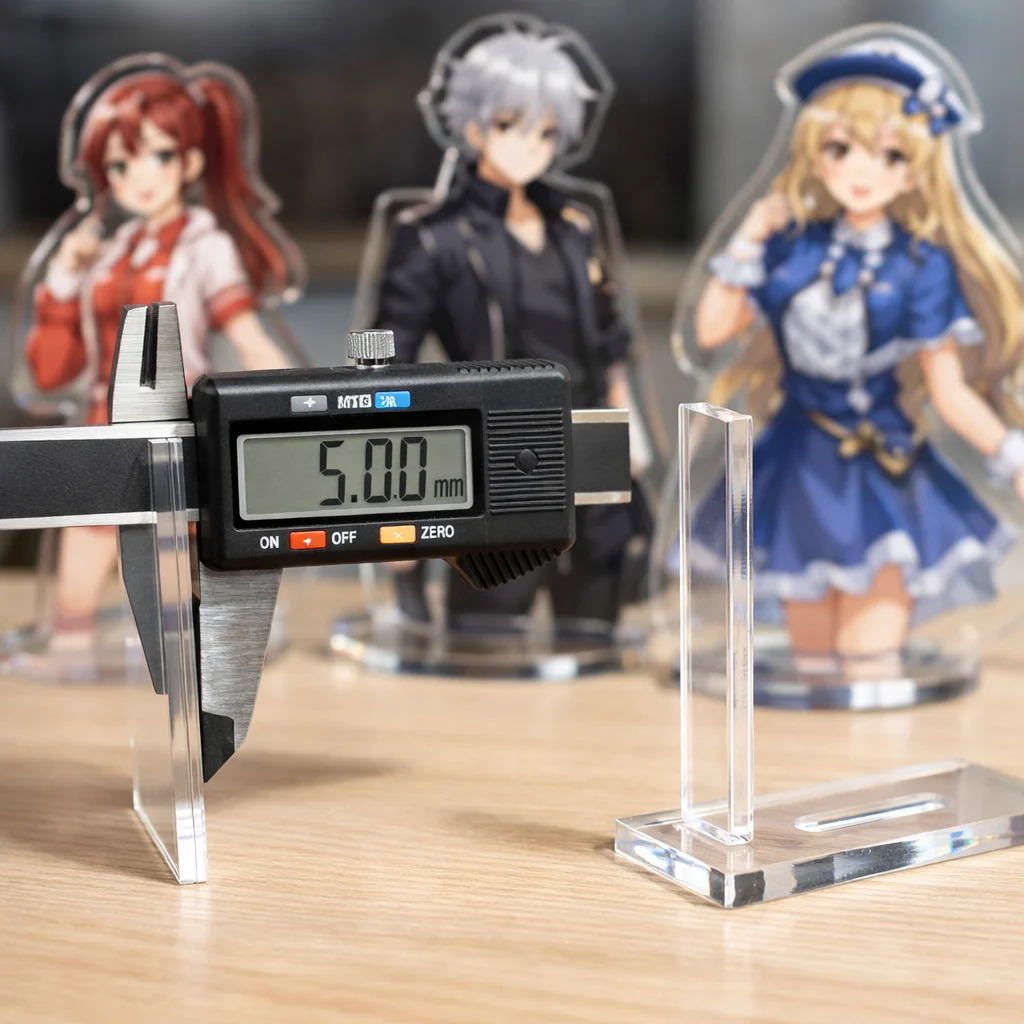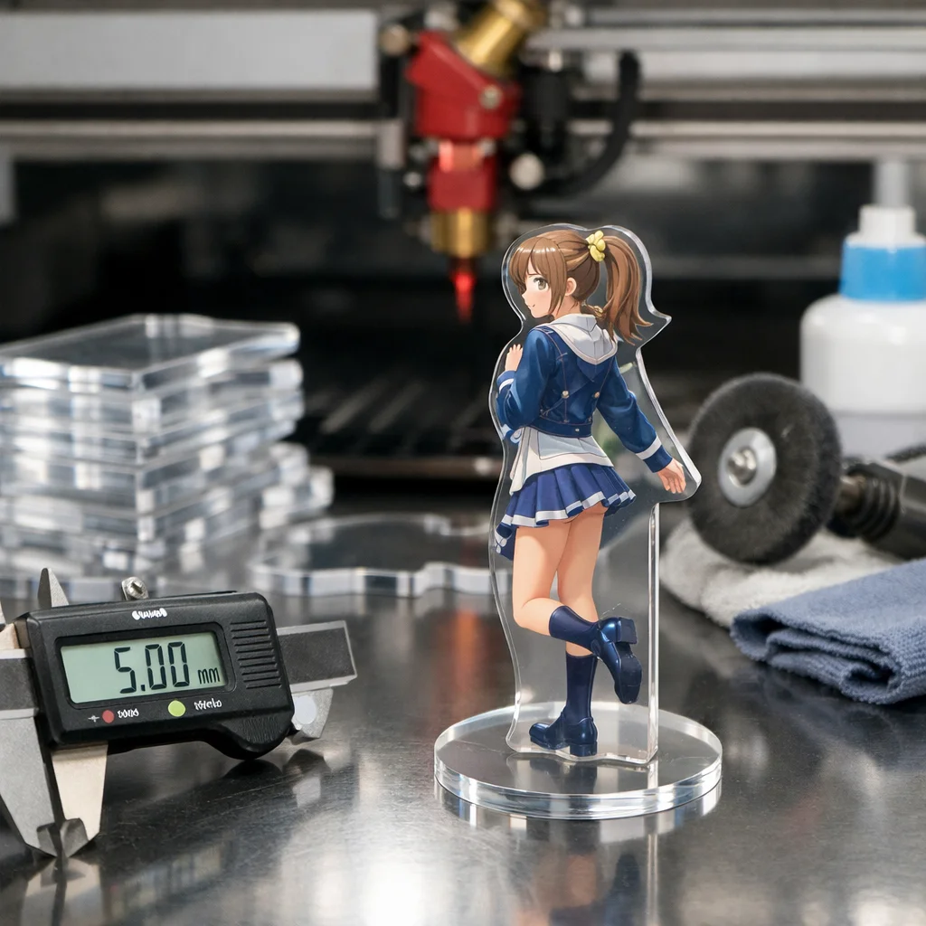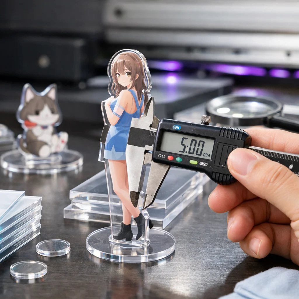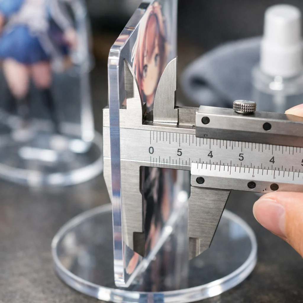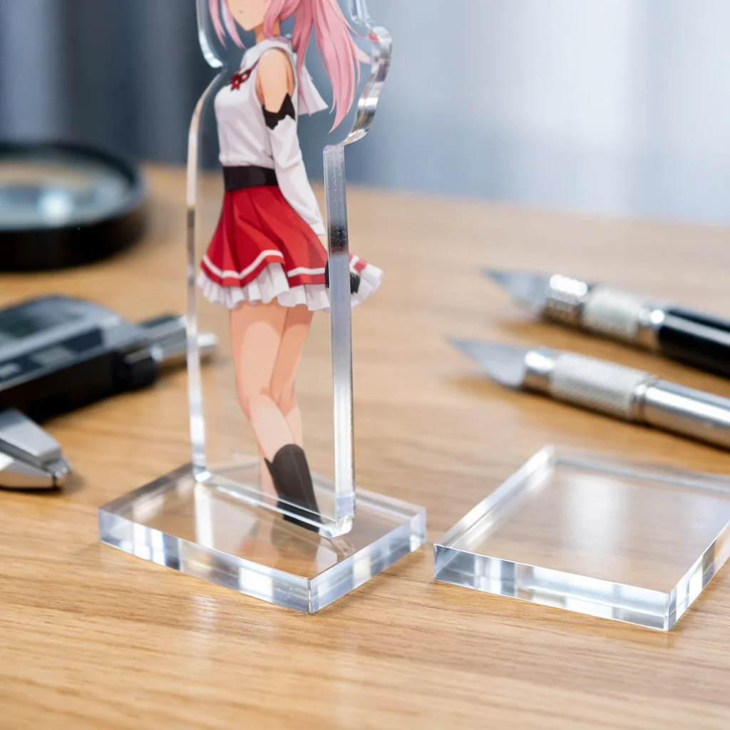 さらに、二層または三層構造のアクリルグッズにおいては、接合部分のズレも問題になります。「5mm」クラスの厚みでは、それぞれの層がきちんと合わさるように調整することが求められますが、製造間でのばらつきが生じやすいため、注意が欠かせません。